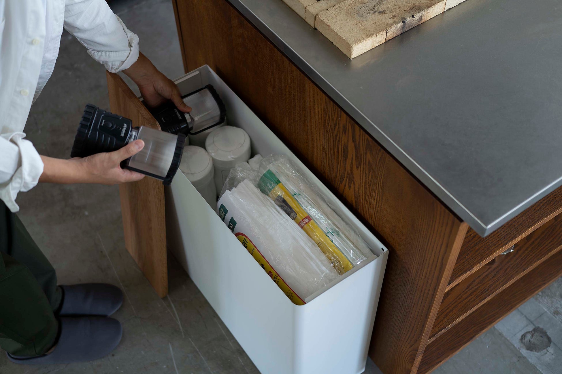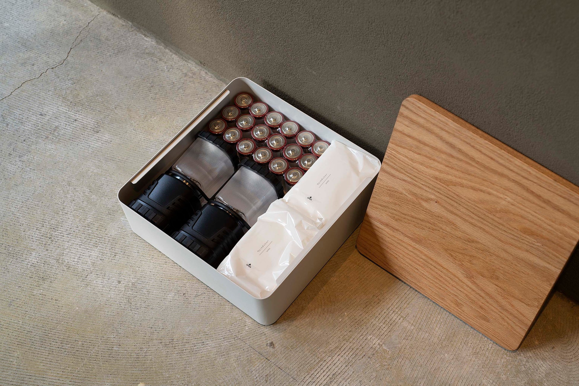 備蓄品をコンパクトに収納できる床置きタイプです。水や簡易トイレ以外の小さめの備蓄品およそ1人分が収まります。高さは約11cm。家電や観葉植物の台などにもお使いいただけます。四隅は丸みをもたせ柔らかな印象に仕上げました。