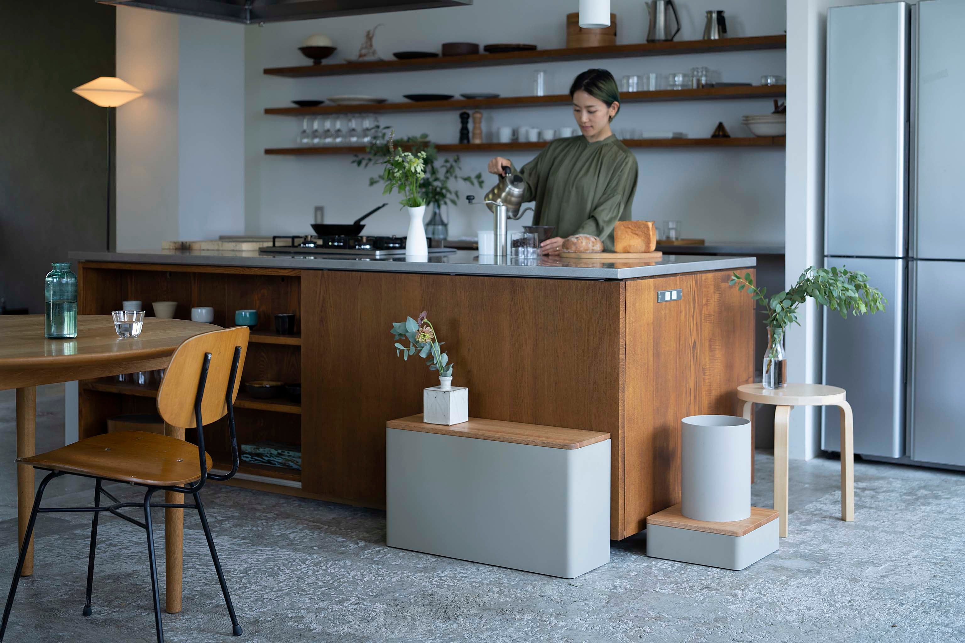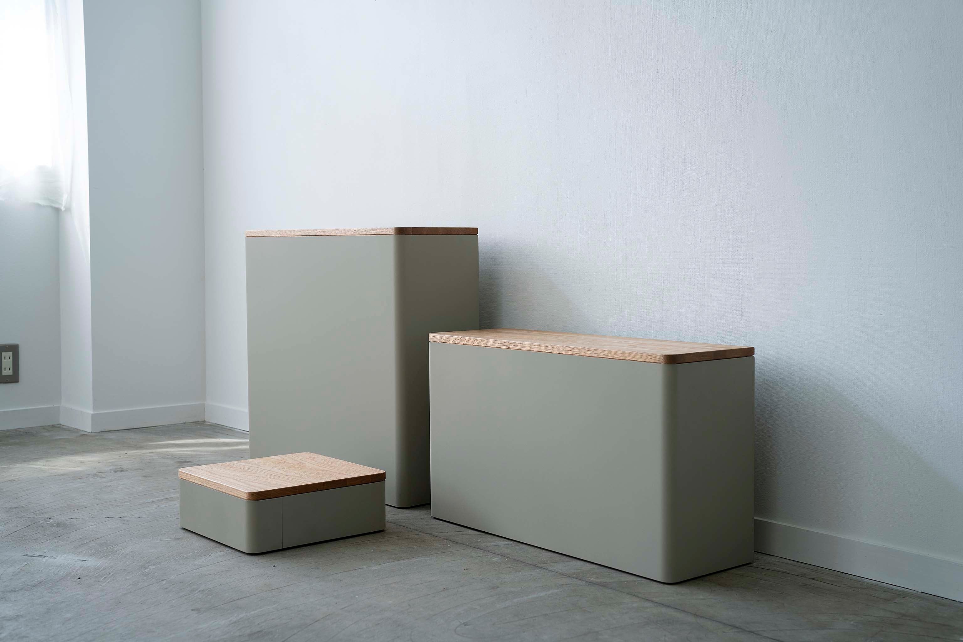 日本の住まいの空間に調和するようオーク材を天板に使用し、正面の角は丸みをもたせ柔らかな印象に仕上げました。そ のままでも自立することはもちろん、複数組み合わせて壁に沿わせ棚のように設置することもできます。