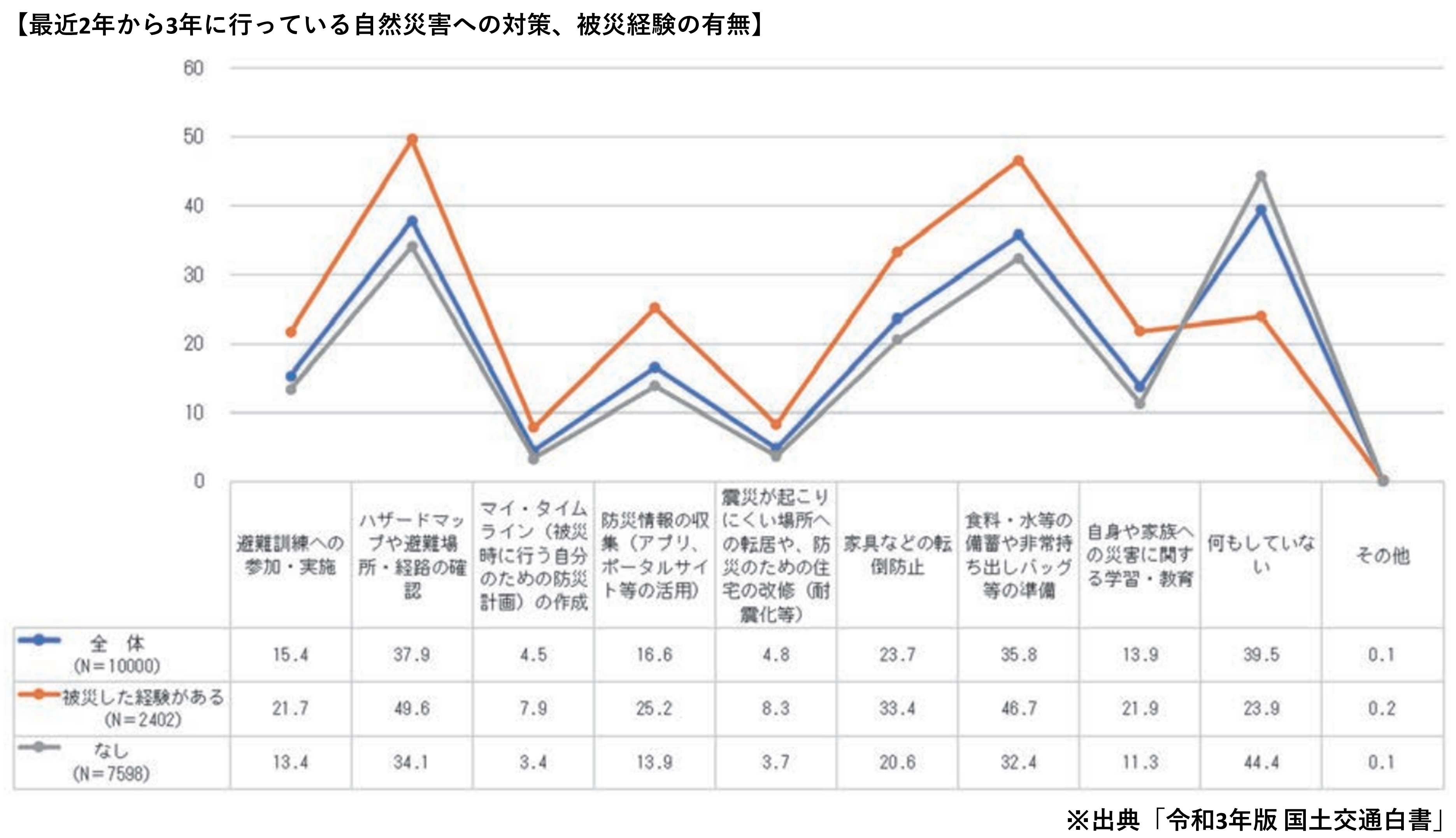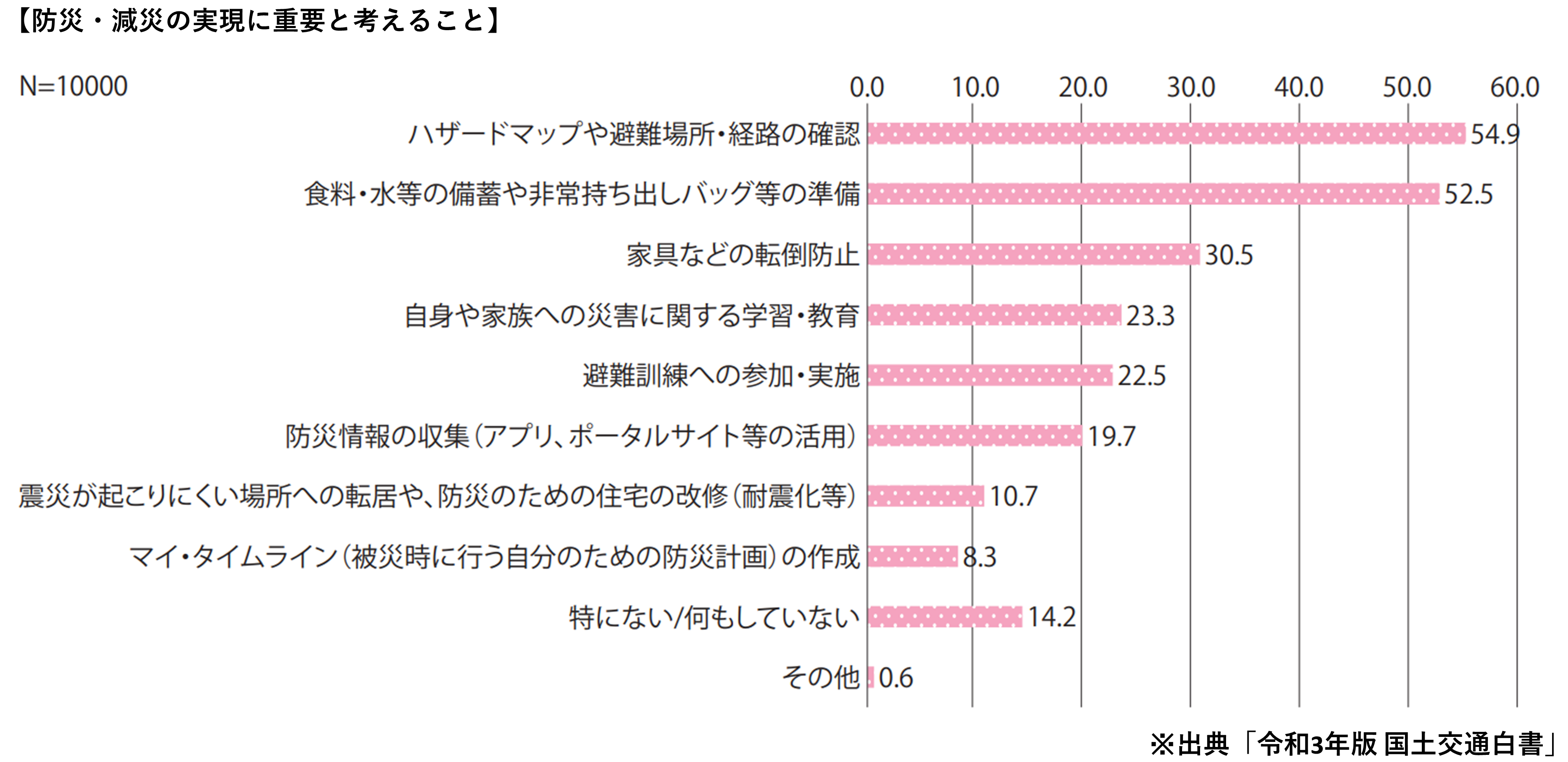 国土交通省が発表した「令和3年版 国土交通白書」によると、防災・減災について重要と考えられている対策として「食料・ 水等の備蓄や非常持ち出しバッグ等の準備」が挙げられています。
