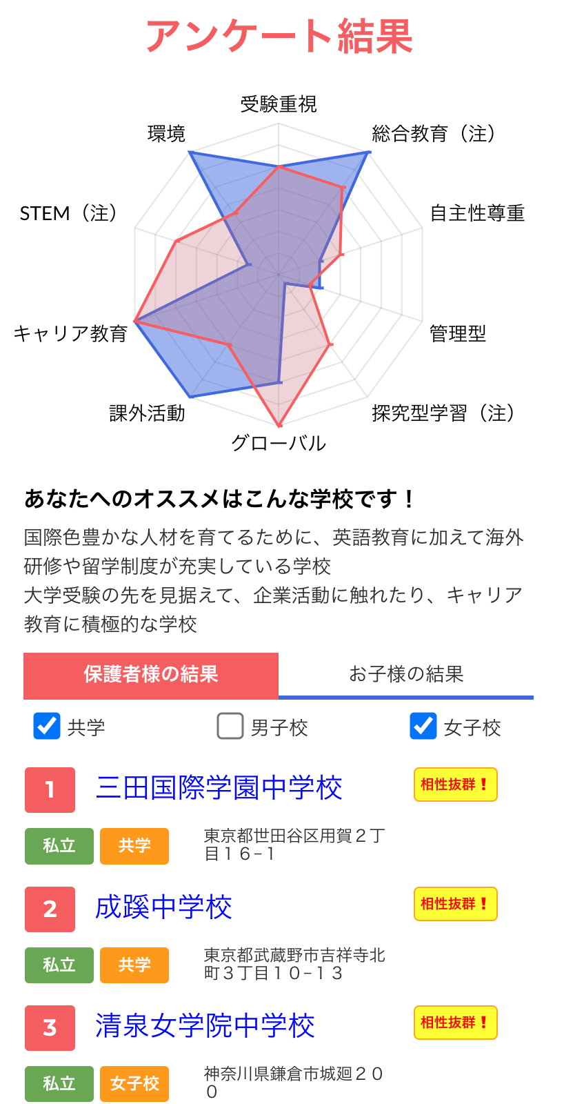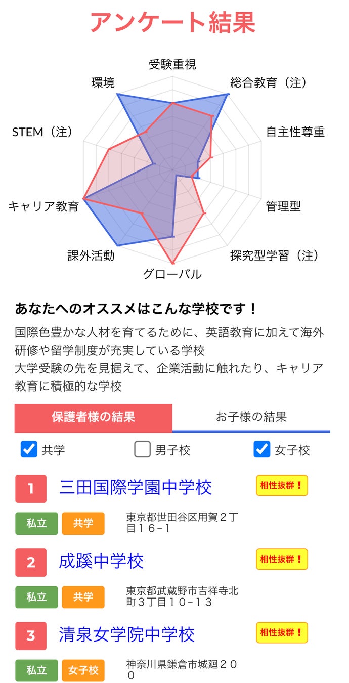 iBerryはこの新しい学校レコメンドサービスを提供する上で、教育ジャーナリストでマザークエスト代表の中曽根陽子氏監修のもと、首都圏近郊の私立中学・高校のもつ「特徴」を、探究型学習、グローバル教育などの10の視点から独自に分析しています。ユーザーは、20のアンケート項目に回答することで、「何を重視して学校を選ぶのか?」を客観視するとともに、その回答に合った特徴を持った学校をレコメンドしてもらうことが可能です。また、アンケートは子どもと一緒に回答して親と子の違いを見ることも可能です。
