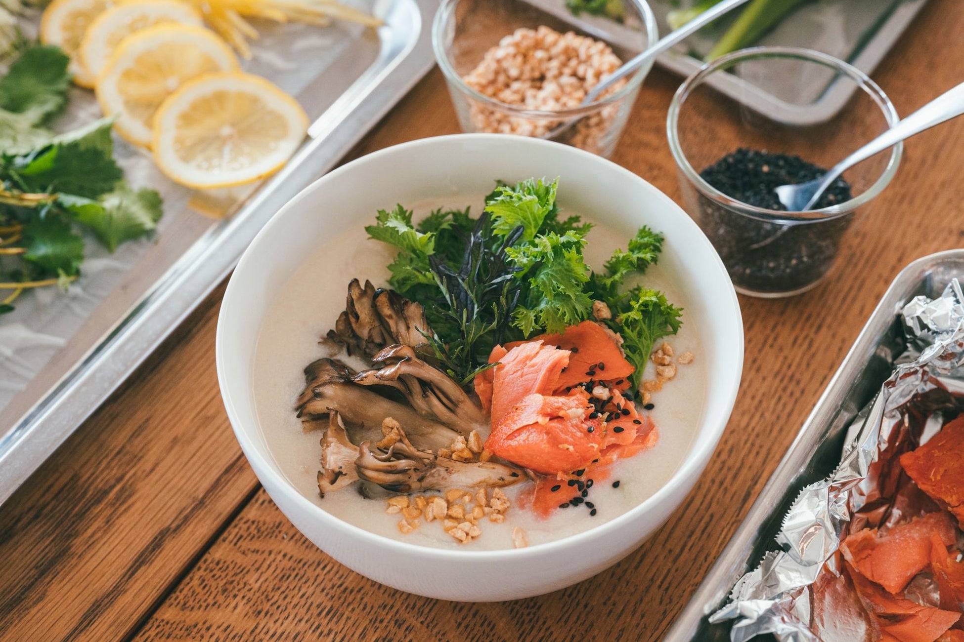 ・焼鮭とキノコの甘酒スープ