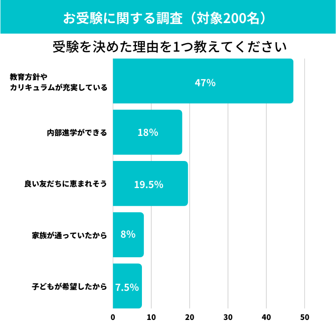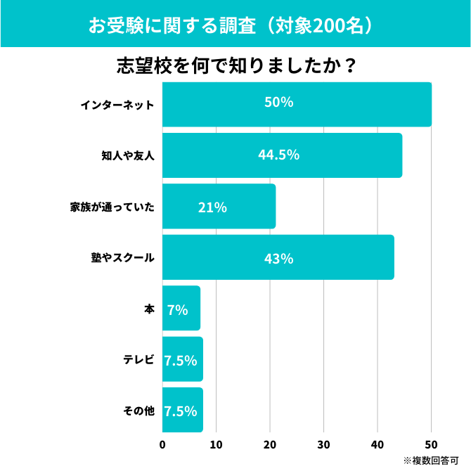 また、受験先の志望校についてどういった方法で知ったか調査したところ、「インターネットを通じてリサーチをされた方」が50%でした。「知人や友人から情報収集をした方」は44.5%、「塾やスクールで知った方」は43%です。その他「家族が通っていた(21%)」「テレビ(7.5%)」「本(7%)」の回答が得られました。(複数回答可)