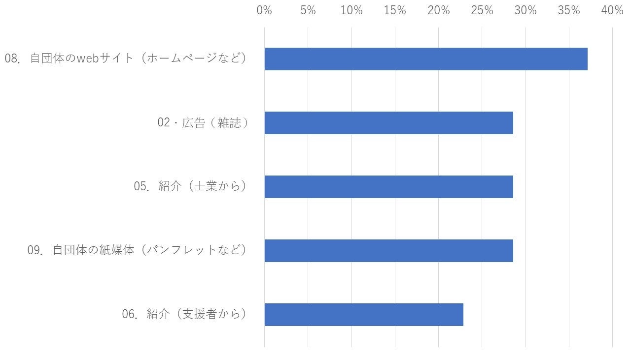 ところで、先の「お問い合わせ件数の変化」で、2020年に対して2021年のお問い合わせ件数が「(やや/かなりを含む)増えた」(36%)回答に絞って、効果を感じる媒体/接点をみると、「自団体のWEBサイト(ホームページなど)」(35%)、「広告(雑誌)」(29%)、「紹介(士業から)」(29%)、「自団体の紙媒体(パンフレットなど)」(29%)と続いた。