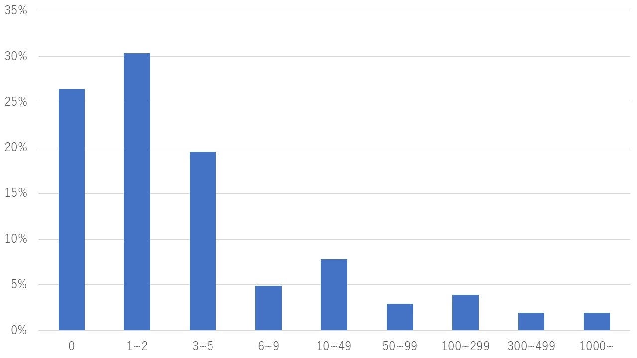 遺贈の受入表明をしている回答のうち、2021年での受入件数は「0」(48%)が最も多く、「1-2件」(26%)、「3-5件」(12%)と続き、0件~9件の一桁代が92%を占めた。