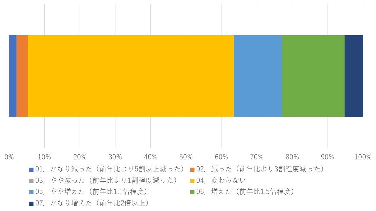なお、増え幅については「やや増えた(前年比1.1倍)」(13%)、「増えた(前年比1.5倍)」(7%)、「かなり増えた(前年比2倍以上)」(7%)となっており、昨年から増加傾向にあることが考えられる。