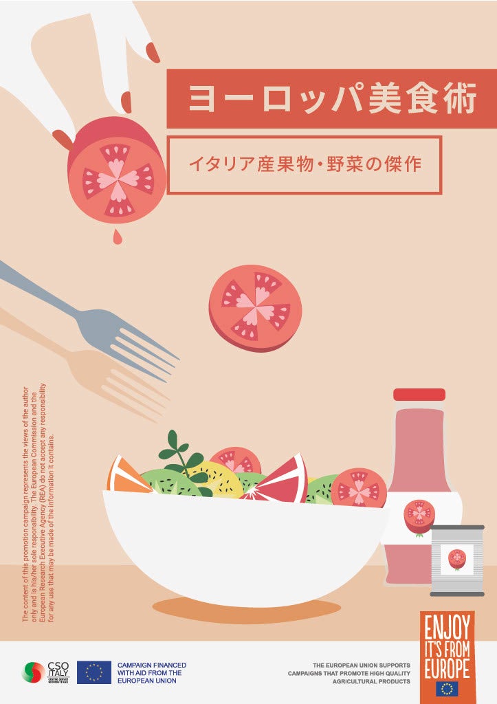 欧州連合(EU)の資金提供の下、CSO Italyがイタリア企業7社と共同で推進。日本、中国、台湾、タイにて、リンゴ、トマト加工品、キウイ、オレンジのプロモーションを展開。