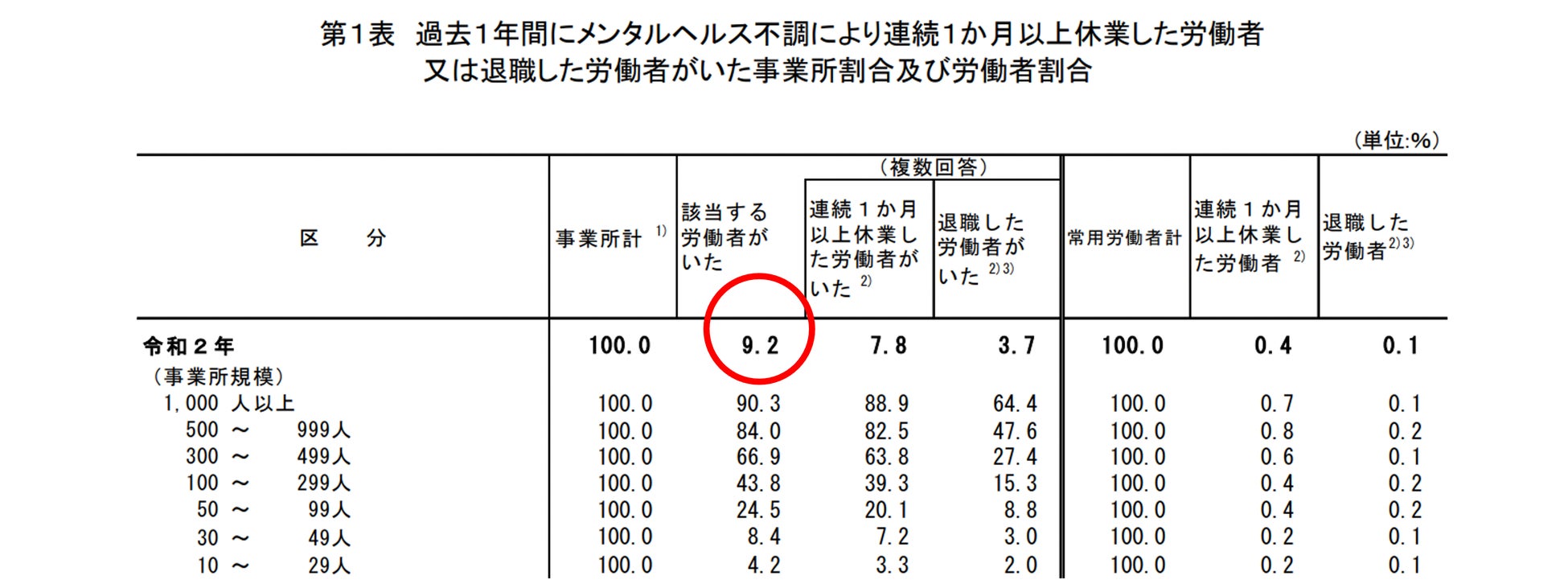 また、厚生労働省が実施した別調査では、メンタルヘルス不調により連続1か月以上休業した労働者又は退職した労働者がいた事業所の割合は 9.2%となっています。