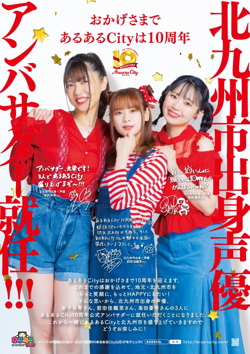 そんな想いから、北九州市出身の声優、金子有希さん、前田佳織里さん、高田憂希さんの3名にあるあるCity10周年公式アンバサダーに就任いただくことになりました。