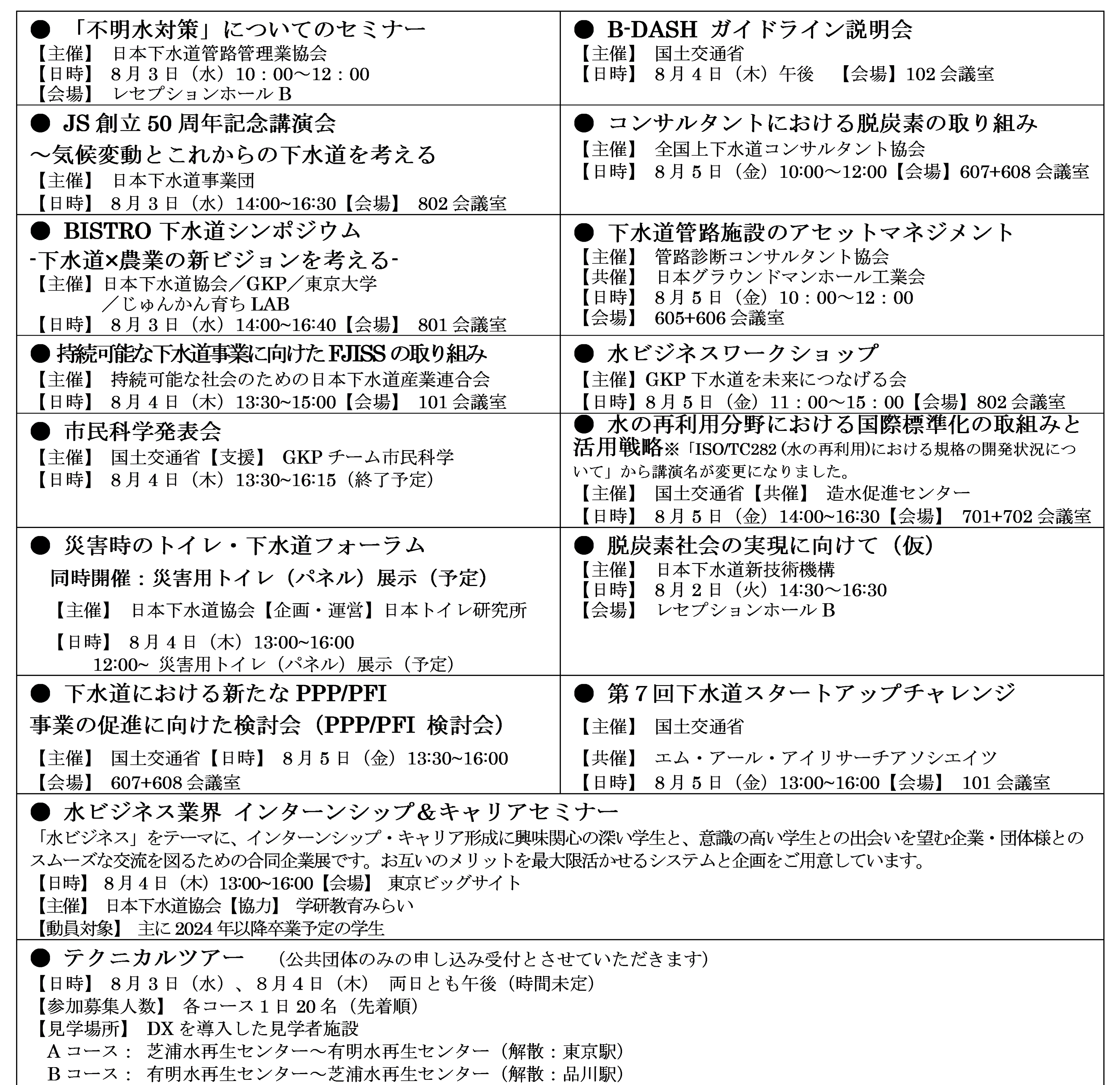 | ● 「不明水対策」についてのセミナー 【主催】 日本下水道管路管理業協会 【日時】 8月3日(水)10:00~12:00 【会場】 レセプションホールB |