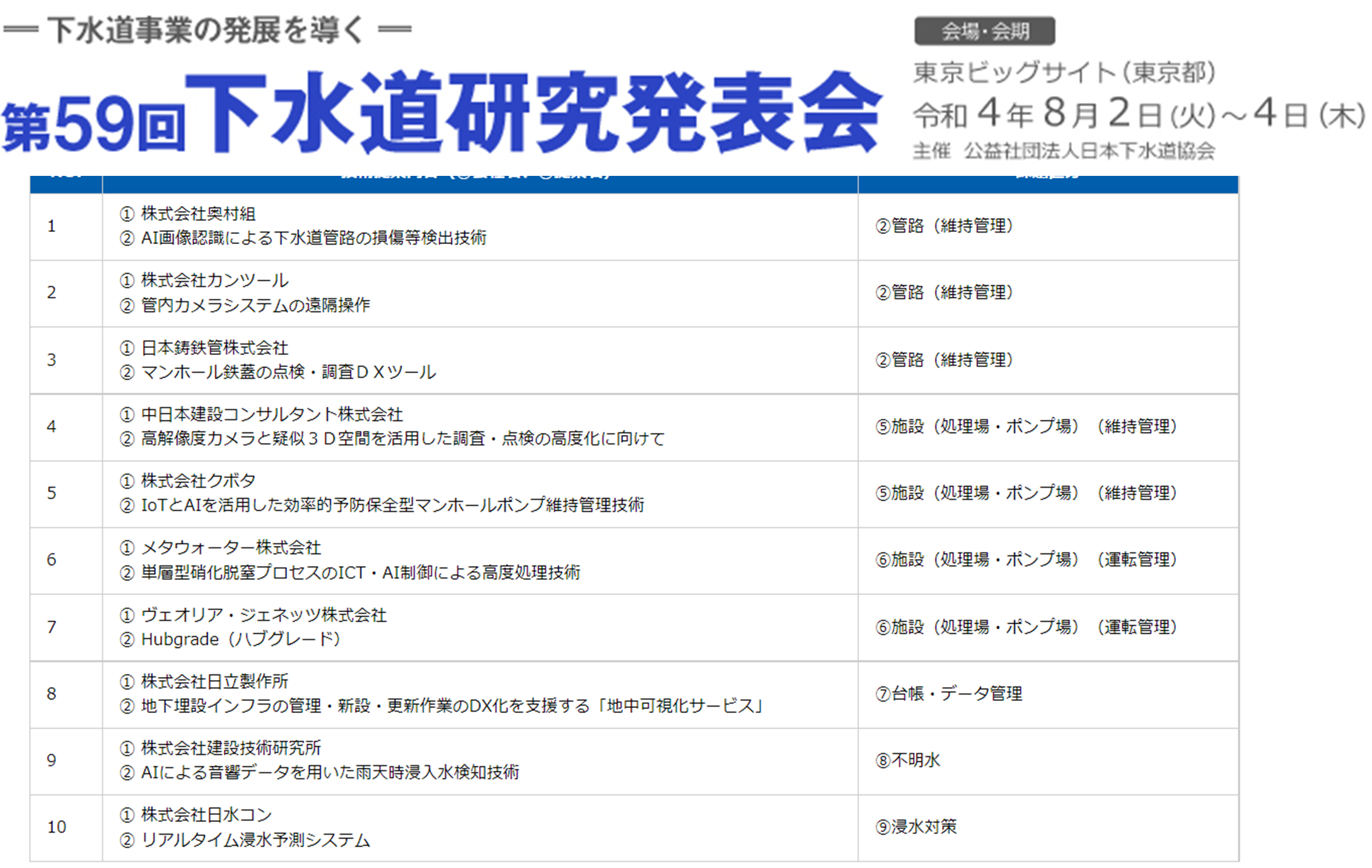 下水道のICT技術(DX)に関する技術紹介セミナー発表予定企業/8月2日〔火〕開催予定
