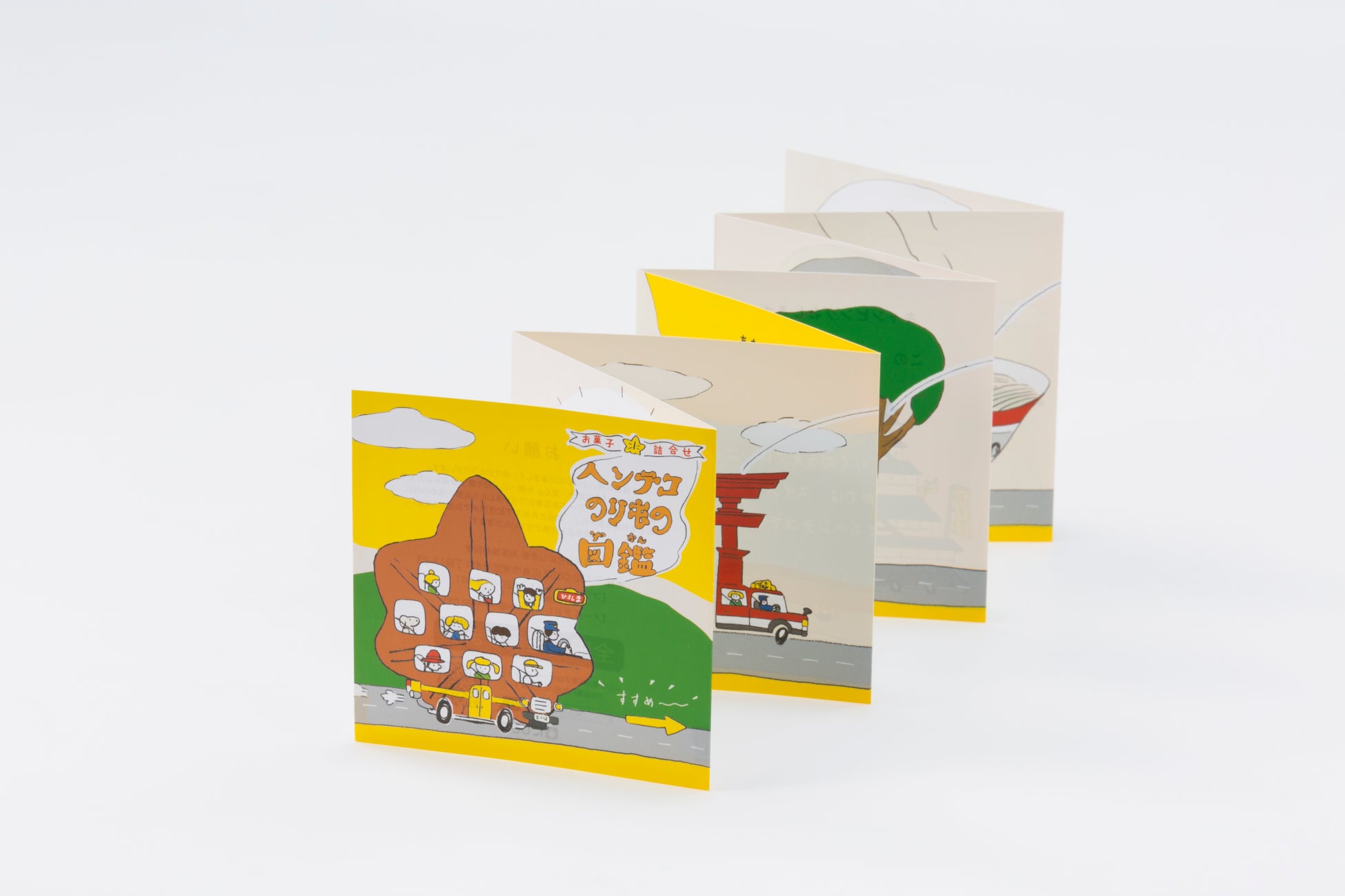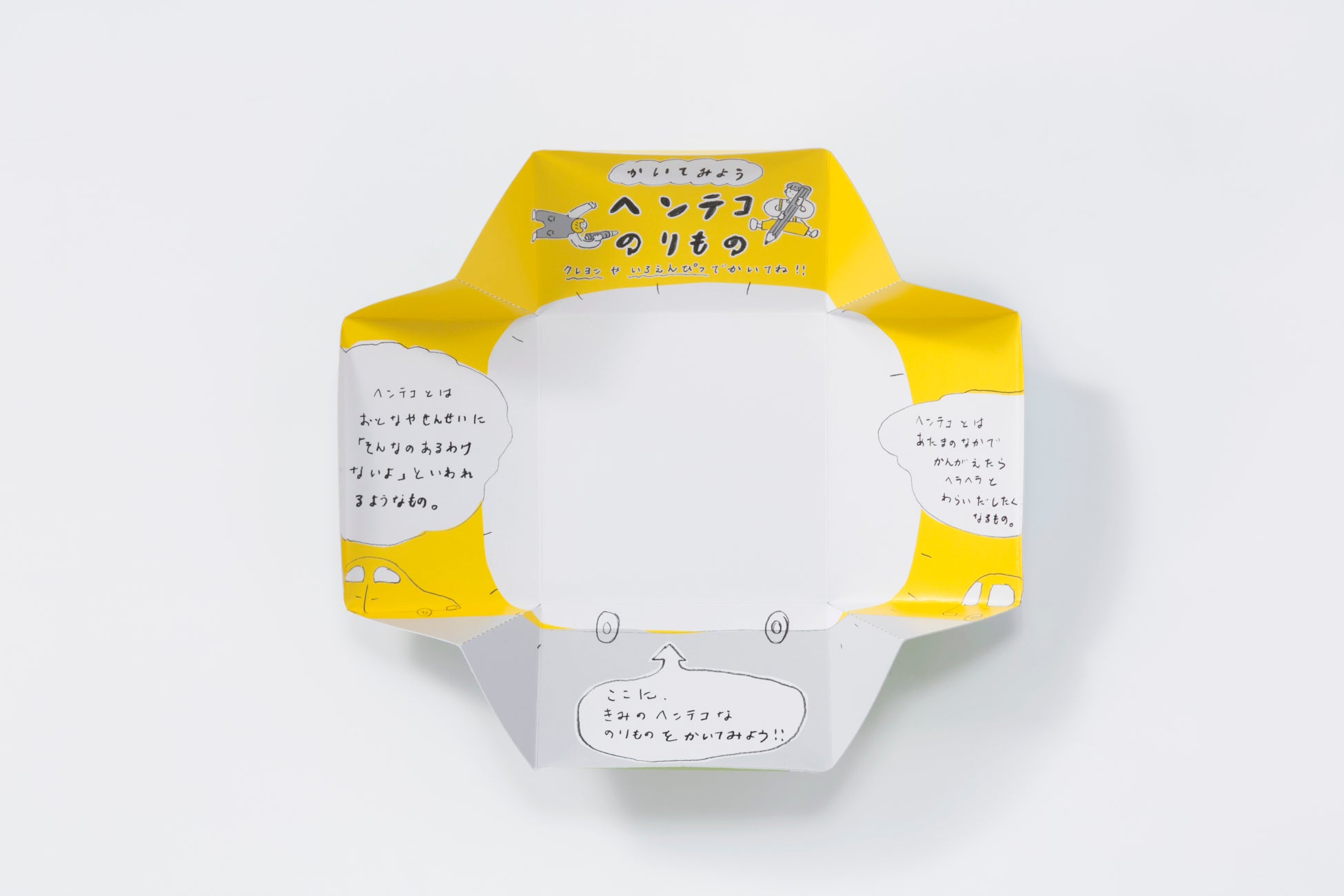 BOXの中には、ミヤタさんが考案した8種類のヘンテコのりものを紹介した図鑑が入っています。また、内箱には皆さんが考えたヘンテコのりものを描くスペースも作りました。是非、大人も子どもも一緒にヘンテコのりものを描いていただき、美味しいお菓子も食べながら、家族みんなで楽しんでいただければと思います。