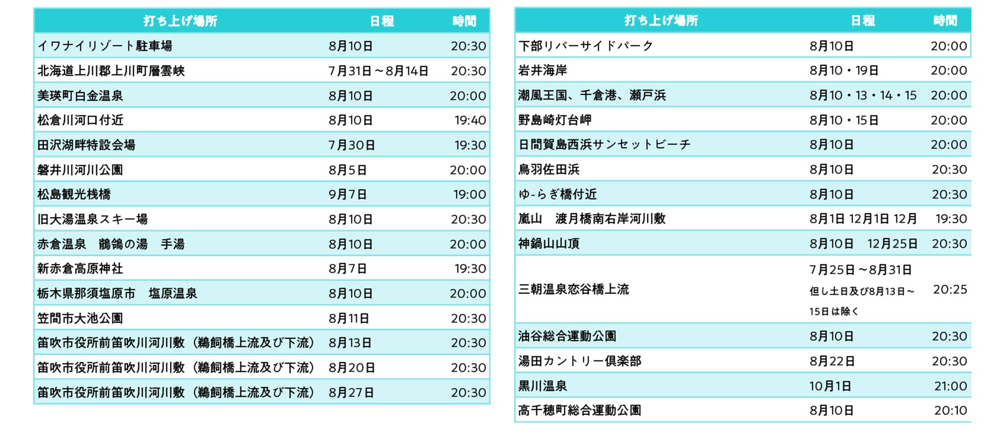 全国の旅館・ホテルが公益財団法人日本煙火協会協力のもと、全国各地で8月10日を中心に花火を打ち上げます。コロナ禍で失われつつある、日本の伝統文化を支える文化活動を行うと同時に、地域の活性化、子供たちの思い出作りを図ることを目的とした取り組みです。