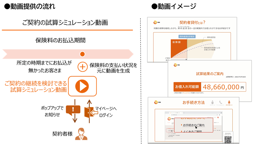・従来の書面による通知方法に加え、パーソナライズド動画の活用により、ご契約者様に対する契約内容の試算シミュレーションの提案がスムーズになり、ご契約者様が意図しない契約の失効や解約に対する代替案を提示することが出来る。
