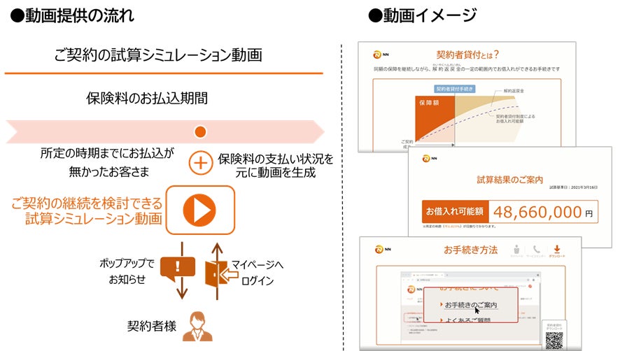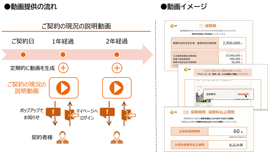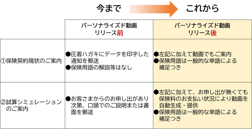 これにより、ご契約者様は郵送でのお知らせに加え、専門的な保険用語を分かりやすく解説した個別動画で、現在の契約内容を把握することが出来るようになります。