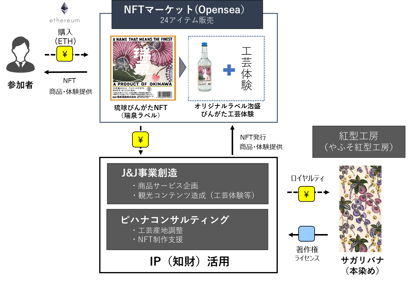 この取り組みの第一弾として、琉球びんがたラベルの泡盛購入権付NFTを2022年7月上旬に那覇市内で開催された IVS(国内外のスタートアップ経営者・上場企業経営者が集う国内最大級のカンファレンス)にて展示・販売しました。琉球びんがたの知的財産(IP)は、連携するやふそ紅型工房及び一般社団法人琉球びんがた普及伝承コンソーシアムが提供し、IPの管理とNFTの発行をJ&J事業創造とピハナコンサルティングの両社で行いました。また、NFT購入者には、琉球びんがた工房訪問の権利もあわせて付与し、デジタル資産の枠を超えた価値を持たせ、地域における来訪者と産地の交流機会の創出も狙いました。