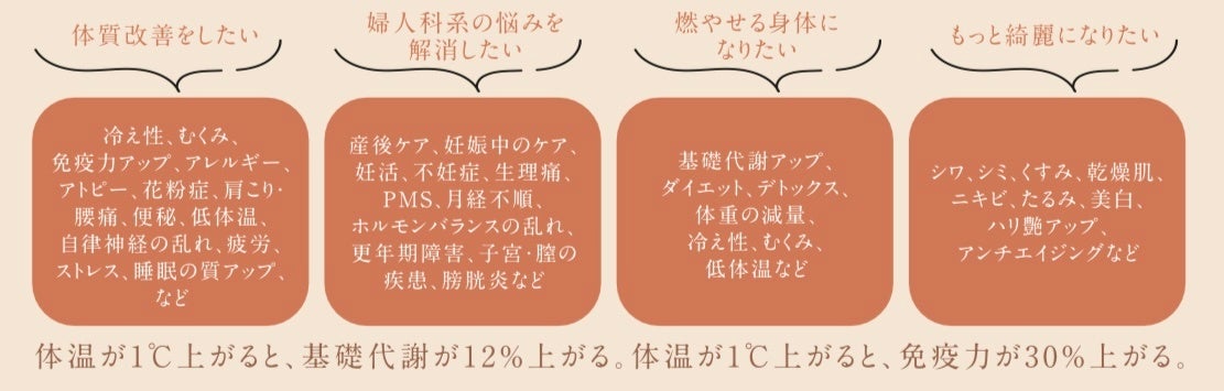 現代女性の約7割が「冷え」を自覚しているとされており、平均体温が36℃以下という低体温の方も増えてきています。内側から身体を温める温活は現代女性が抱えている様々な不調やお悩みの根本的な改善が期待できるとされ、中でもよもぎ蒸しは自己治癒力や自己回復力を高め、本来持っている力を最大限引き出す健康の土台づくりをサポートします。