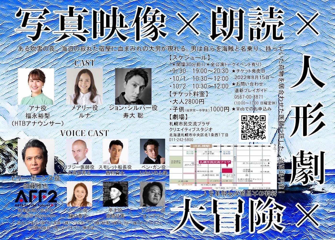 今作のヒロインである姉妹の役は、北海道の朝を盛り上げるHTBの大人気番組「イチモニ」にて活躍される福永裕梨アナウンサーとルナが演じ、謎の男ビリー・ボーンズを加藤雅也、片足の男ジョン・シルバーを寿大聡が演じます。