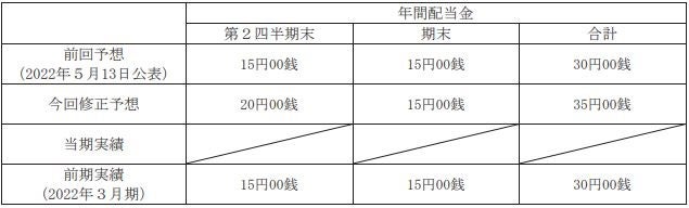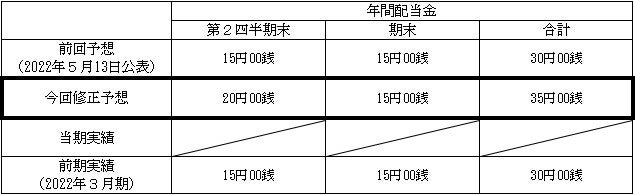 当社は、株主の皆様に対する利益還元は経営の最重要課題と位置付け、企業としての競争力の向上と企業価値の最大化の追求によって、長期かつ安定的な配当を継続するとともに業績や内部資金の確保などを総合的に判断し、配当性向は40%程度とすることを基本方針としております。以上の方針に基づき、2023年3月期の中間配当につきましては、2023年3月期第1四半期の業績が堅調に推移していることを勘案し、1株当たり5円の増配を実施することといたしました。これにより2023年3月期の1株当たり中間配当は20円となり、年間配当予想は1株当たり35円、配当性向は44.6%となる見込みです。