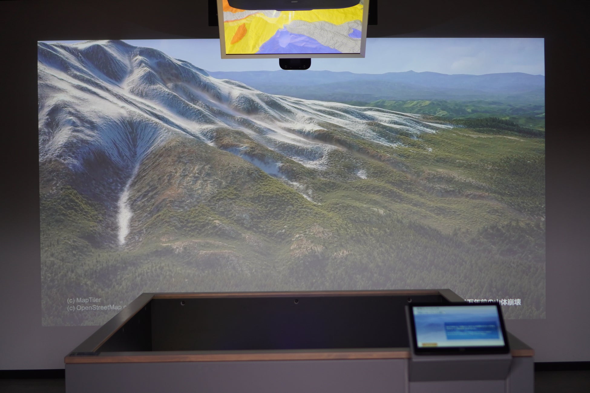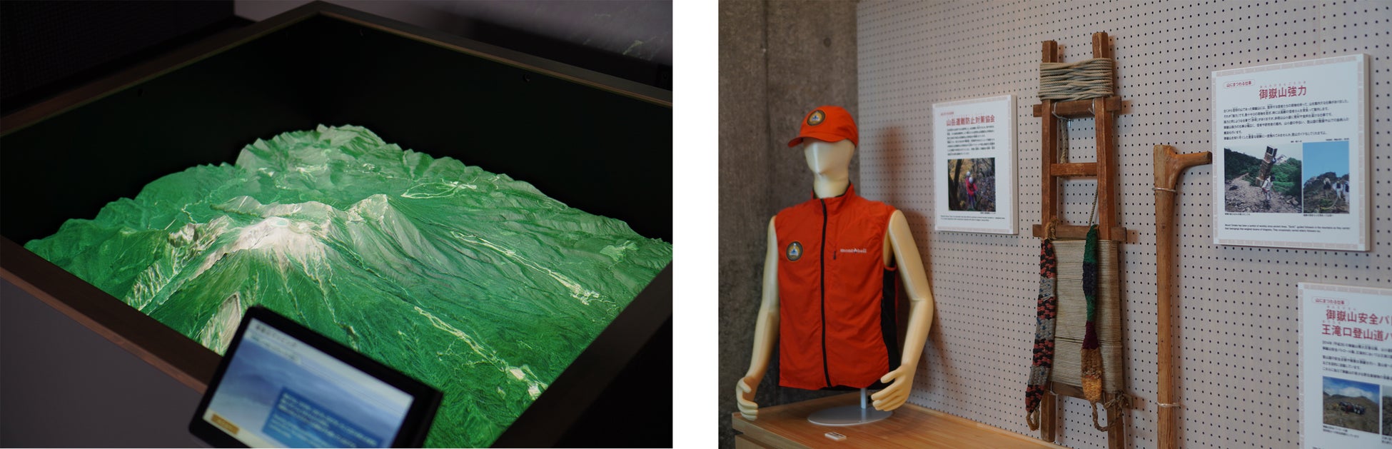 木曽の成り立ちがプロジェクションマッピングで紹介される「木曽の大地に生きる」、御嶽山の自然の魅力を紹介するパネル「御嶽山の歴史とめぐみ」、2014年に起きた噴火の概要と救出活動の様子を伝える「災害の伝承」の3つの展示を常設。子どもから大人まで、山に登らなくても活火山・御嶽山の知識を得られる機会を提供いたします。