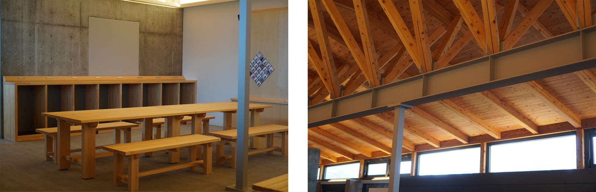 ▲(左)コンセント完備の休憩スペース / (右)館内には木曽地域産の木材が使用されている