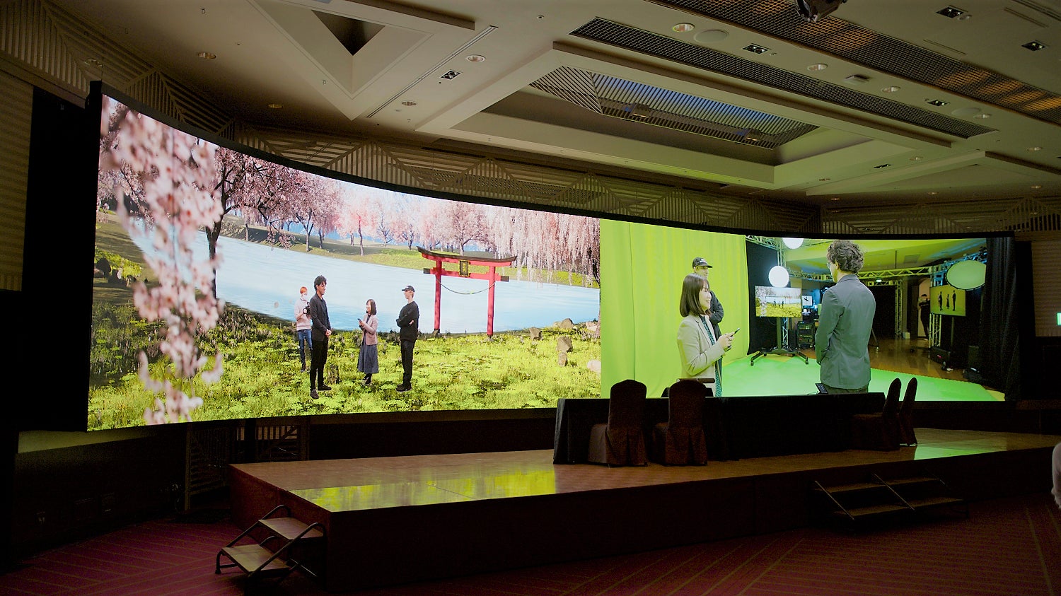 同ホテルの4階「菊の間」に、国内ホテル最大級の湾曲LEDウォールが設備されています。世界最高水準のLEDウォールと音響機材が完備されたイベント会場に、スタジオからコンテンツをストリーミングすることが可能です。