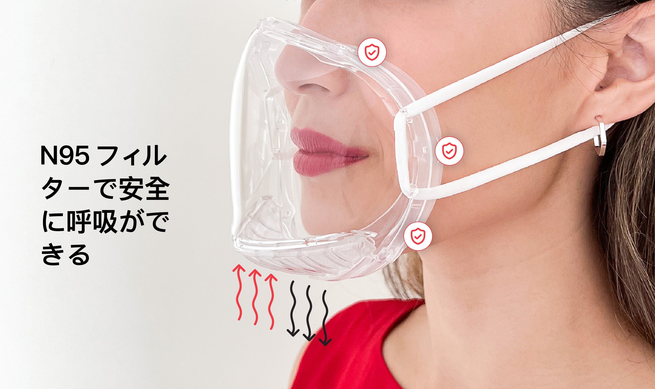 くもり止め加工の全透明構造で表情を隠さずに安全かつ快適に呼吸ができます。
