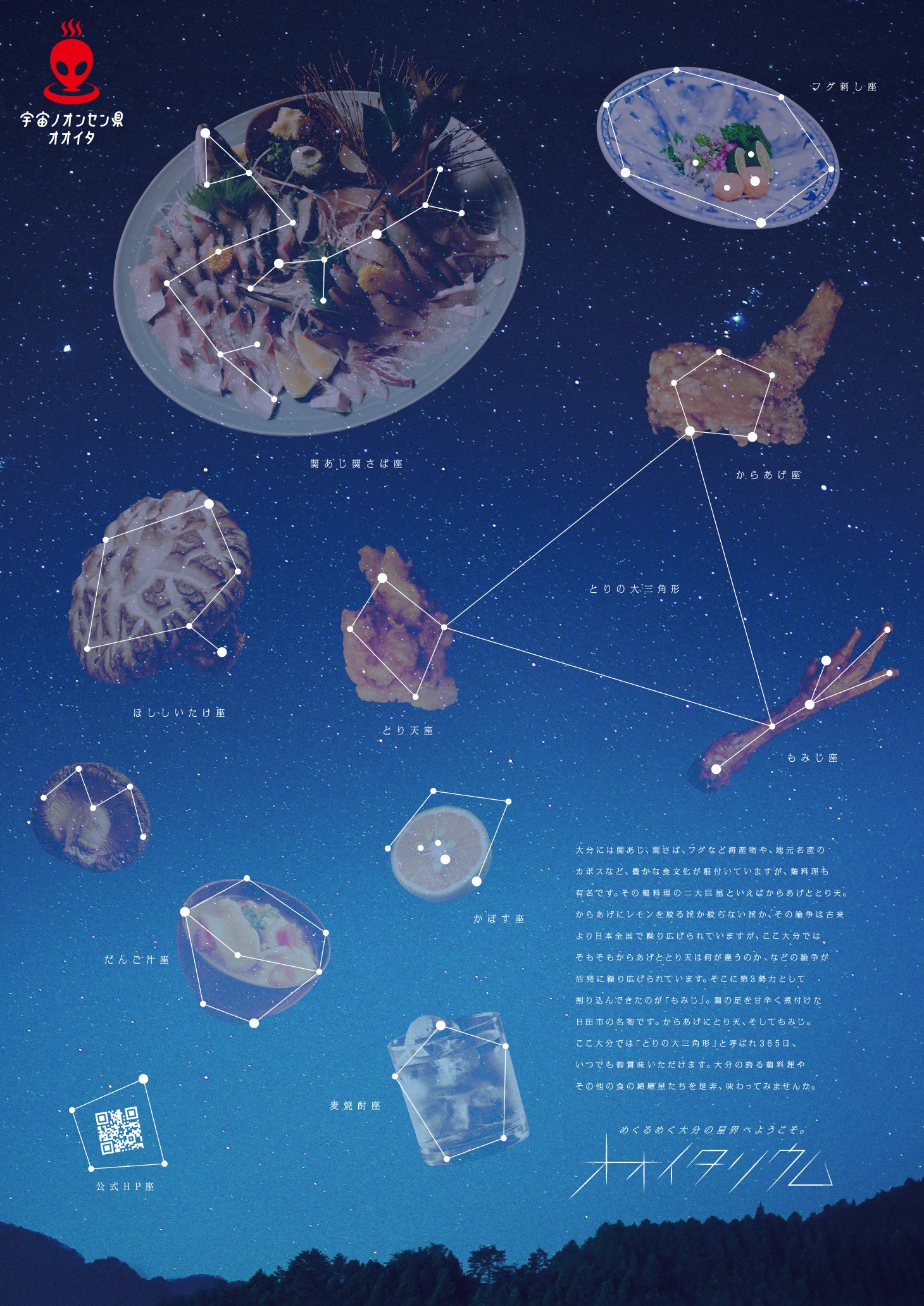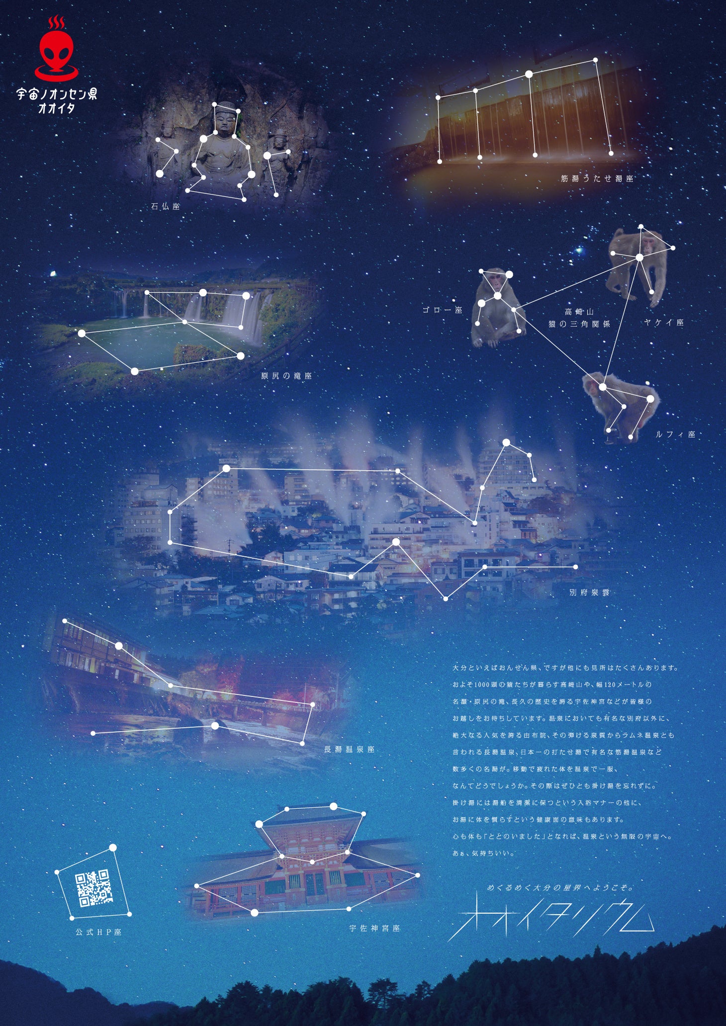 加えて、動画、ポスターの展開、昨年度も実施し好評を博した「宇宙人割」もパワーアップして再登場。「オオイタリウム」独自のユニークな星座を模したスタンプの配布や、県内各地のホテルや旅館、観光施設等にご協力いただき、様々なプロモーションを行います。