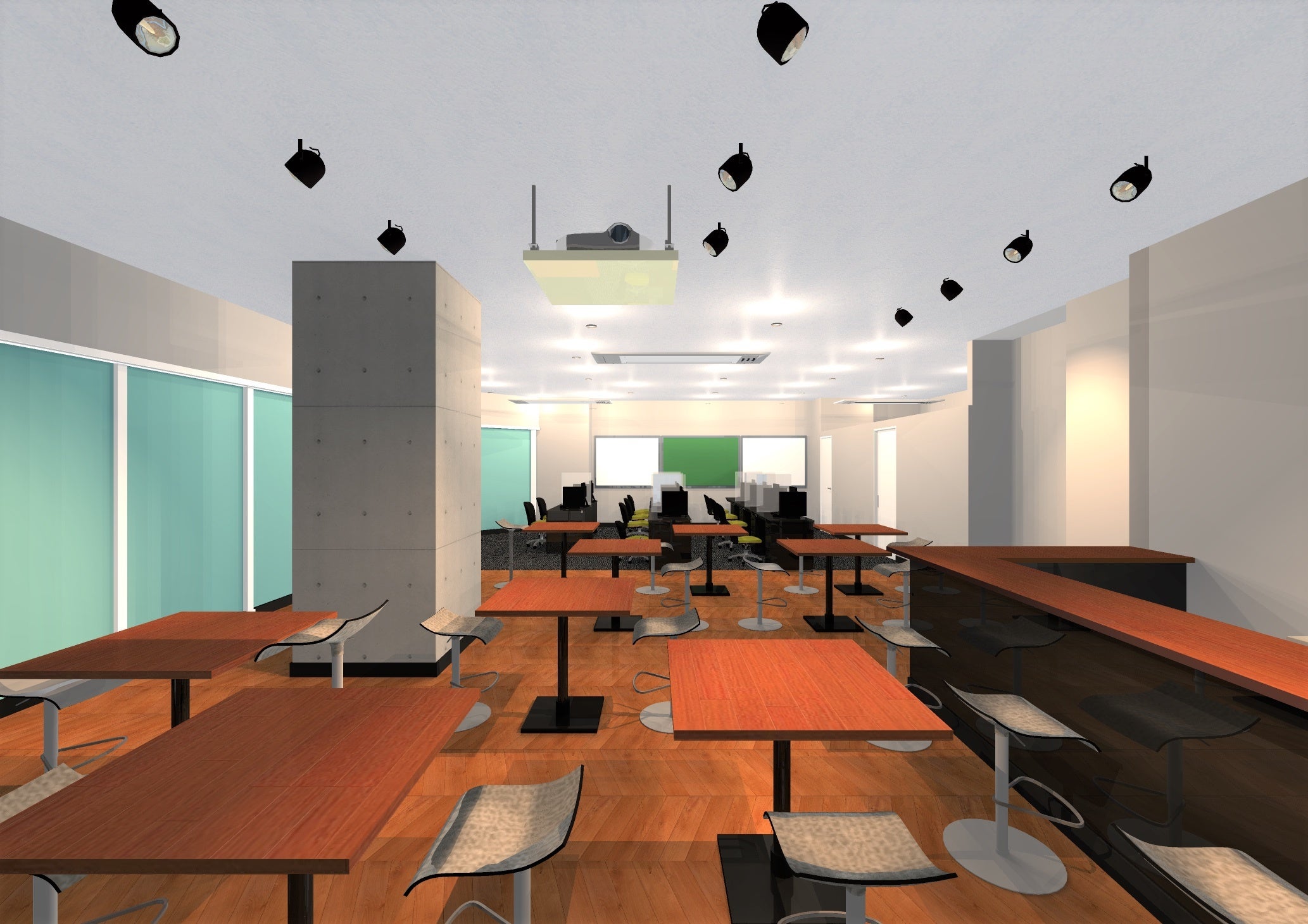 併設するオープンエリアは150インチ相当のプロジェクタスクリーンを設置。