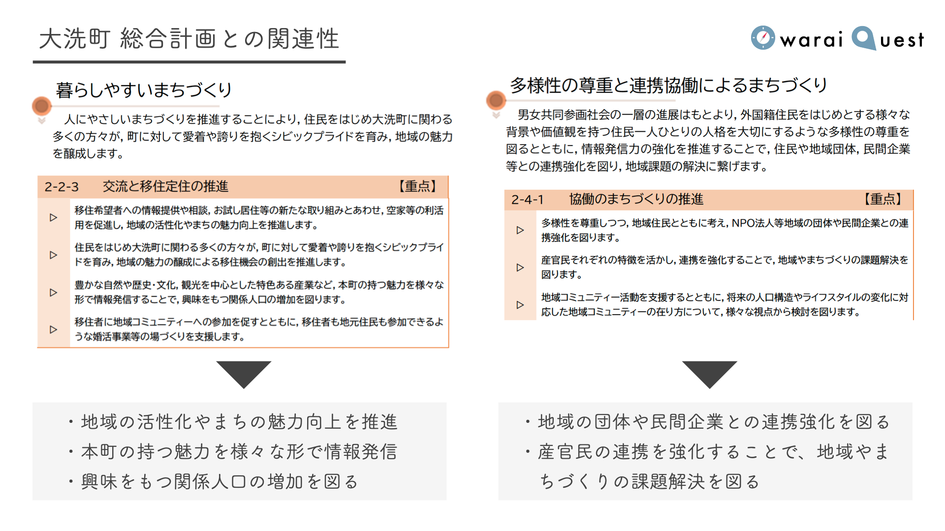 大洗魅力発掘プロジェクトは、イベント開催のみで終わるのではなく、継続的に町を探索して魅力を発掘できる取り組みにするべく、大洗町の新しい地図「Owarai Quest Map」を制作し、町を訪れた方にその地図を活用できるようにします(2023年3月までに完成予定)。観光用の地図とは違った視点での地図として、地域のことを知る、地域に触れる、地域で発見がある体験型の地図として、地域づくりに関わる関係人口の創出に貢献していきます。