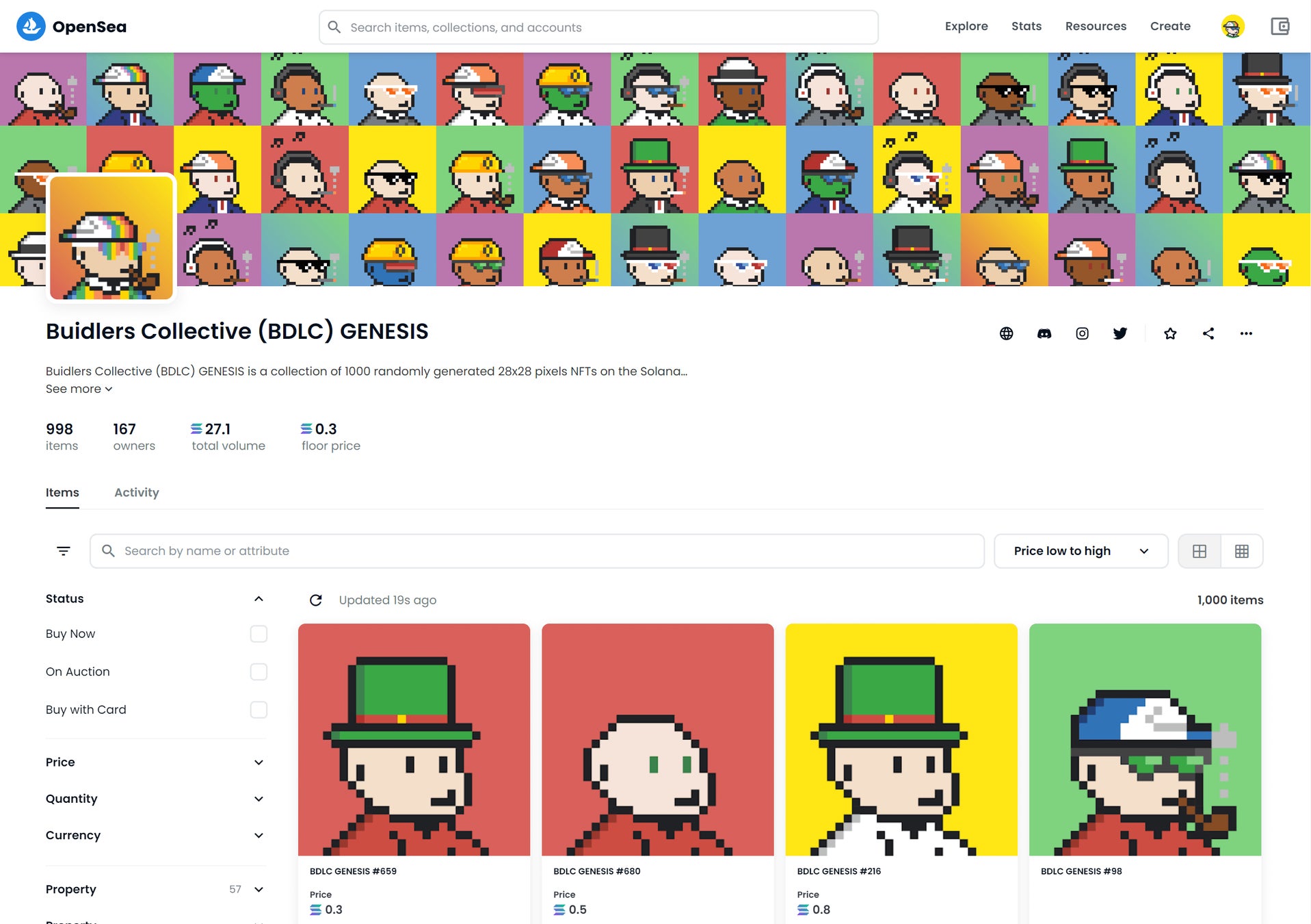 Buidlers Collective (BDLC) GENESIS は、Solana ブロックチェーン上でランダムに生成された 1000 個の 28x28 ピクセル NFT コレクションです。各 Buidler はユニークであり、希少性の異なるさまざまなタイプと属性が付与されています。