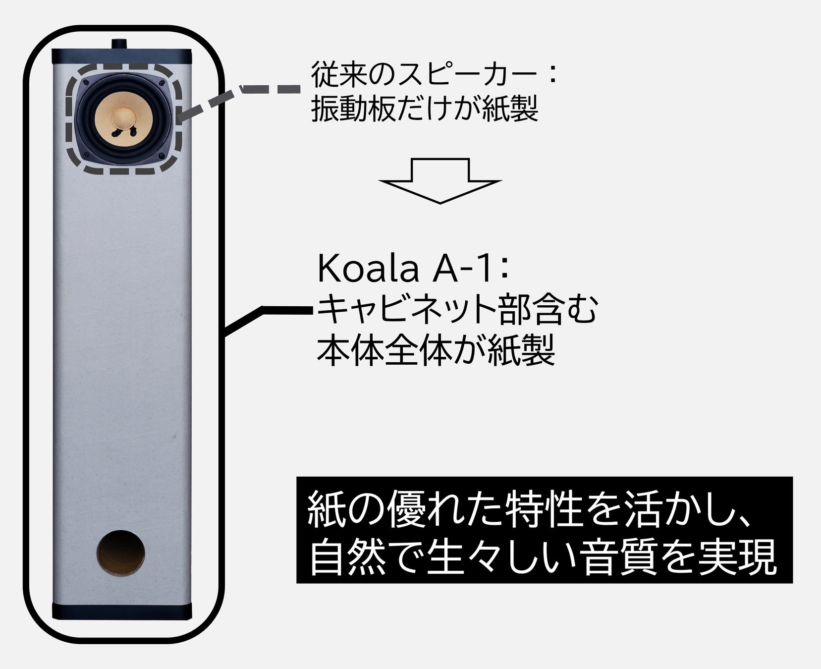 本体の大部分を紙で製作したスピーカー"Koala A-1"を開発。環境性、インテリア性、音質を高い次元で両立。