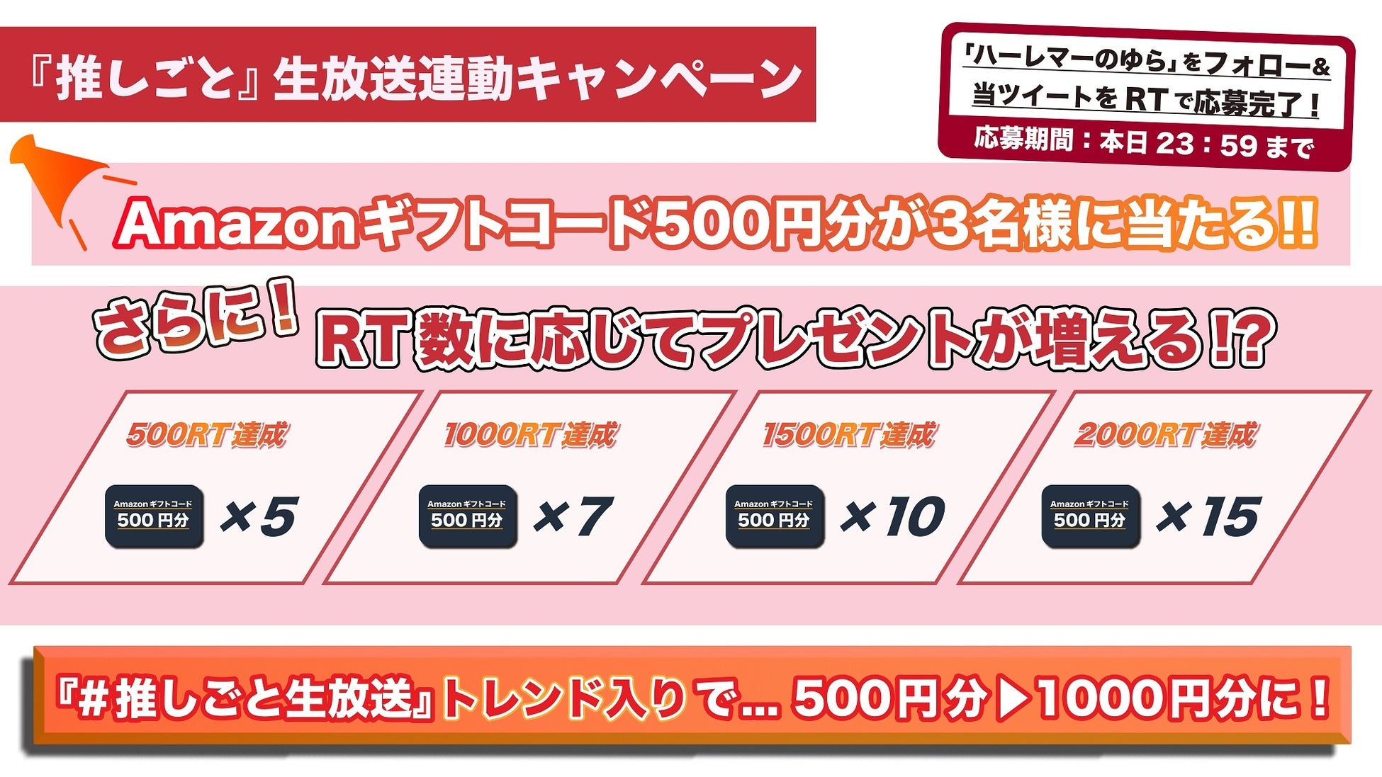 さらに、『#推しごと生放送』をつけてツイートすると、ツイートしたアカウントの当選確率が上がります。また、『#推しごと生放送』がトレンド入りすると、プレゼントされるAmazonギフトコードの金額が500円から1000円に上がります。