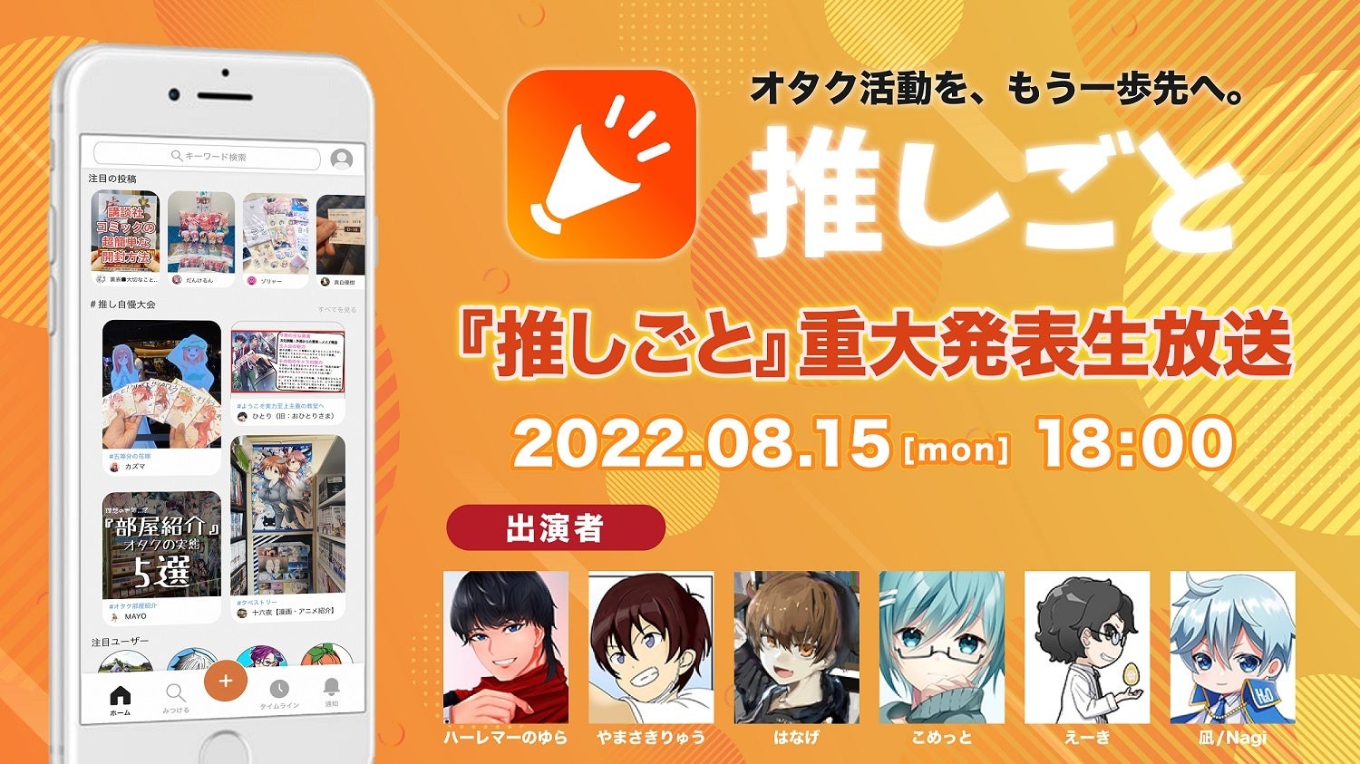 株式会社blessing CODA(代表取締役:小鹿野裕太)は、2022年8月15日(月)に「推しごと重大発表生放送」を開催し、「推しごと」に関する4つの重大情報を発表しました。