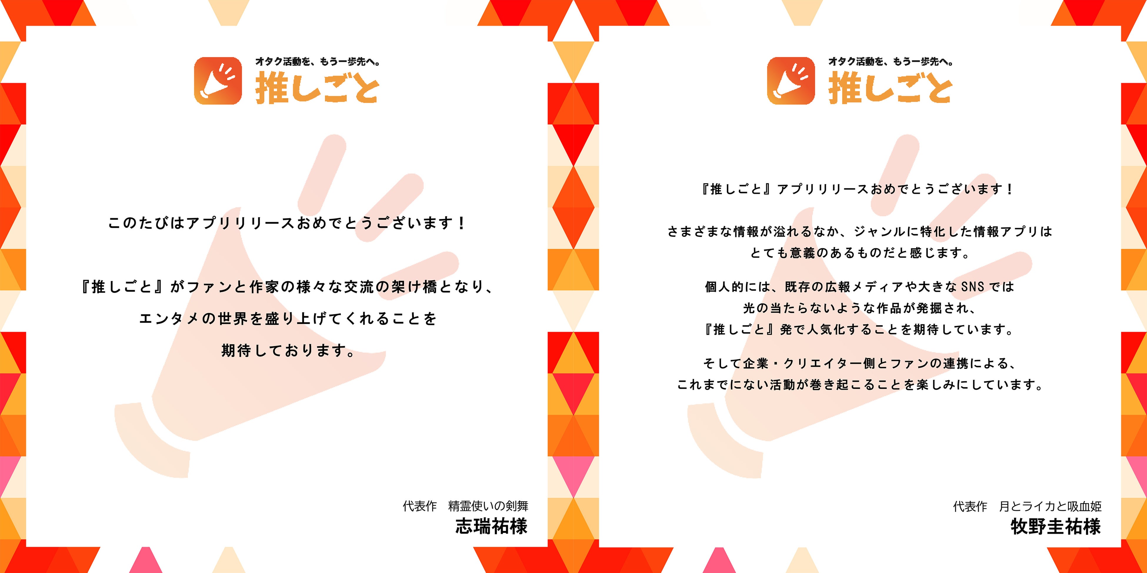 『精霊使いの剣舞』の志瑞祐先生や『月とライカと吸血姫』の牧野圭祐先生をはじめとする、総勢12名の人気クリエイター様から、『推しごと』のリリース決定記念のお祝いのコメントをいただきました。いただいたコメントはクラファンサイトにてすべて公開しております。