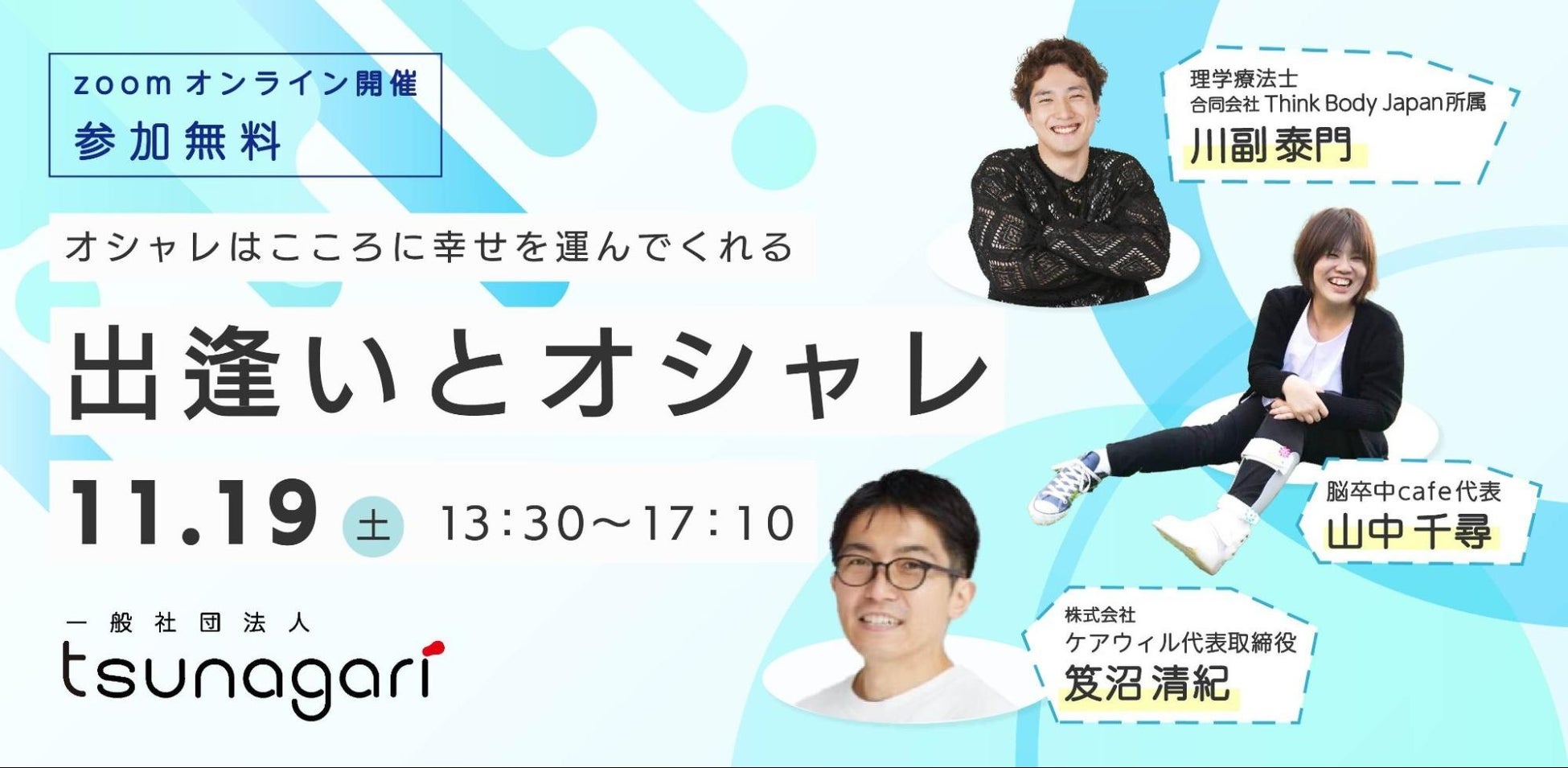 今回は「出逢いとオシャレ」をテーマに、脳卒中当事者・理学療法士・起業家の3名の方にご登壇いただきます。