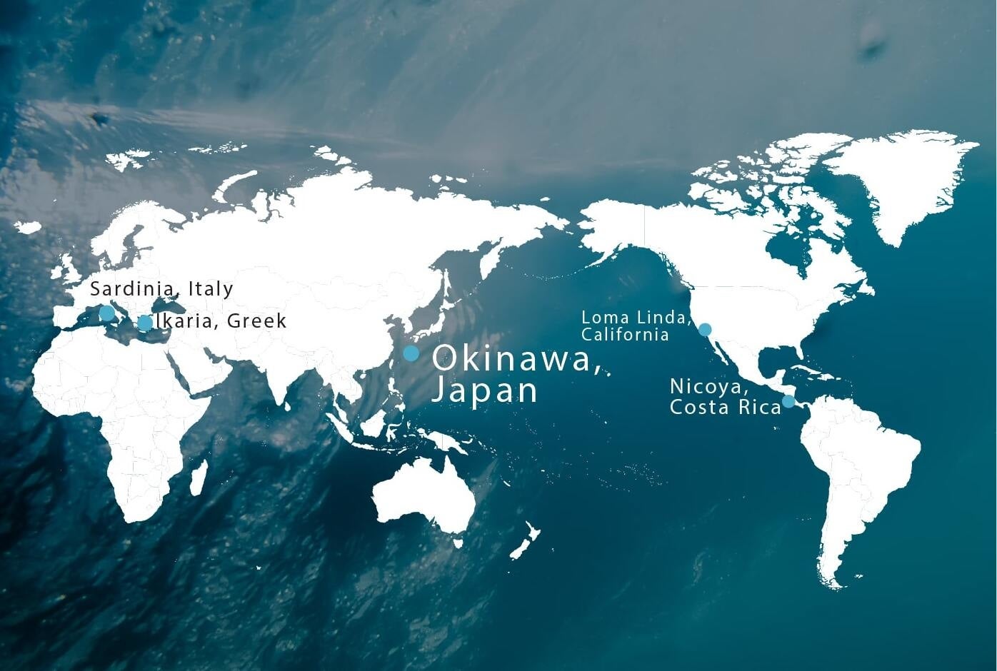 “ブルーゾーン”とは、世界5大長寿地域のことで、イタリアの疫学者で医師のジャンニ・ペスがイタリアのサルディーニャ島を指して作った言葉が初出です。2000年、ジャンニ・ペスとベルギーの人口統計学者ミシェル・プーランはサルディーニャ島での人口統計学的手法による長寿研究成果を国際誌に論文を発表しました。 ペスとプーランは、長寿の村々を強調する青い円を地図上に同心円状に描き、この円の内側をブルーゾーンと呼びました。その後『ナショナルジオグラフィック』誌のライターであり冒険家のダン・ビュイトナーは、統計的に世界で最も長寿の地域にこの地理的な用語を拡大し、 日本の沖縄、米国カリフォルニア州のロマ・リンダ、コスタリカのニコヤとギリシャのイカリア島を加えてブルーゾーンと発表しました。ナショナルジオグラフィック誌2005年11月号にThe Secrets of Living Longer”(長寿の秘密)という特集が組まれ、その表紙を飾ったのは沖縄県那覇市の波の上ビーチで逆立ちをする男性長寿者で、世界中にインパクトを与えました。2008年、『The Blue Zones~世界の百歳人(センテナリアン)に学ぶ長寿の9つのルール~』(ダン・ビュイトナー著)が全米ビジネス書でベストセラーとなり、 ブルーゾーンは世界中に知られるようになりました。