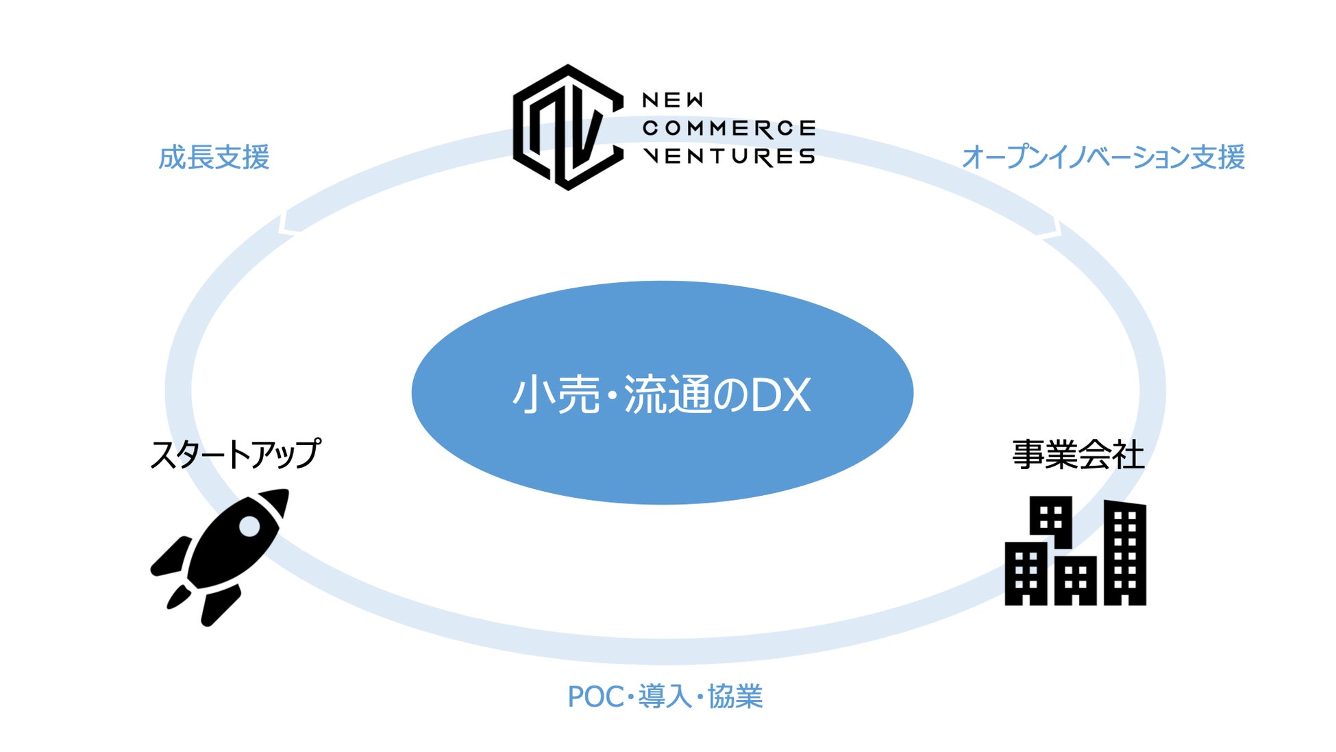 国内においても領域特化VCは多く誕生していますが、小売・流通領域(=コマース領域)に特化したVCは存在していません。NCVは国内初のコマース領域特化VCとして、スタートアップの支援、スタートアップと事業会社を繋ぐコミュニティにより、小売・流通業界のDXへ貢献します。