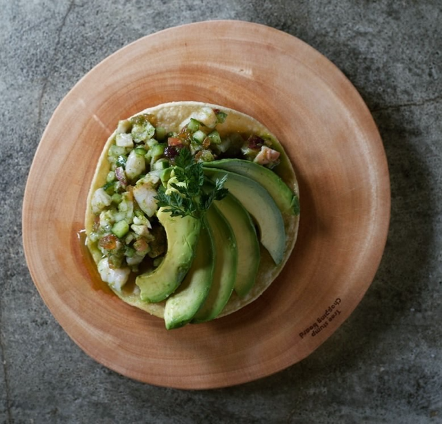 メキシコのエンセナーダで愛されている「グリーントスターダ」を提供します。アボガド、きゅうり、パクチー、トマティージョ(緑ほおづき)など「緑の食材」とエビやタコ、白身魚をあわせました。日本で「グリーントスターダ」を提供しているメキシコ料理店はまったくないと言えるほど、珍しいものです。