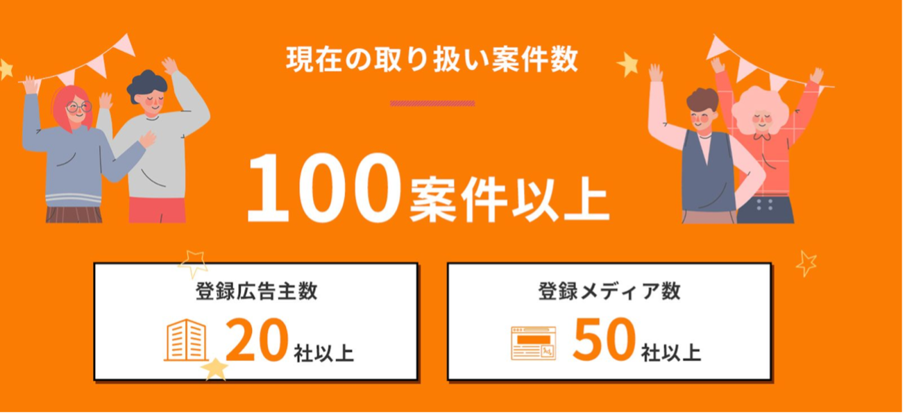 広告主20社以上、メディア数50社以上、登録されている案件数は50案件以上ございます。