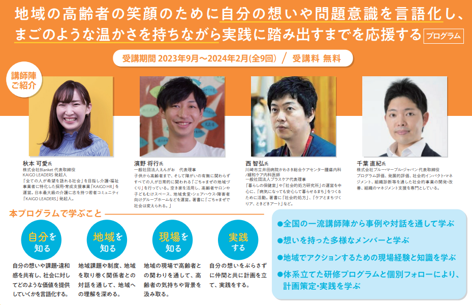 約6ヶ月にわたる座学・実務体験・活動計画への フィードバックなども含む実践的な研修です。自分の想いや問題意識を活かし高齢者や多世代の笑顔を結びつけ、地域に貢献したいという意欲を持つ参加者の成長を力強くバックアップします。