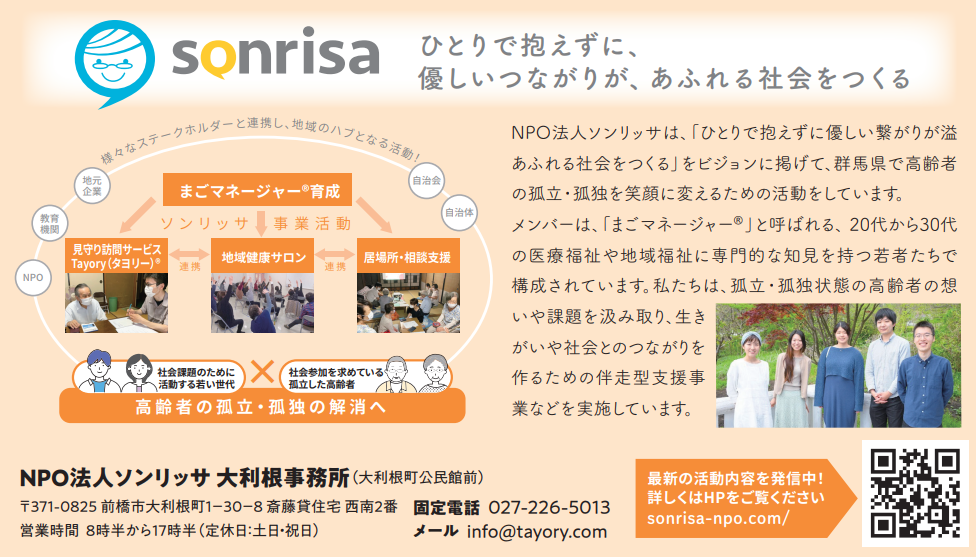 NPO法人ソンリッサは、「ひとりで抱えずに優しい繋がりが溢れる社会をつくる」をビジョンに掲げて、群馬県で高齢者の孤立・孤独を笑顔に変えるための活動をしています。メンバーは、「まごマネージャー®」と呼ばれる、 20代から30代の医療福祉や地域福祉に専門的な知見を持つ若者たちで構成されています。私たちは、孤立・孤独状態の高齢者の想いや課題を汲み取り、生きがいや社会とのつながりを作るための伴走型支援事業などを実施しています。https://sonrisa-npo.com/