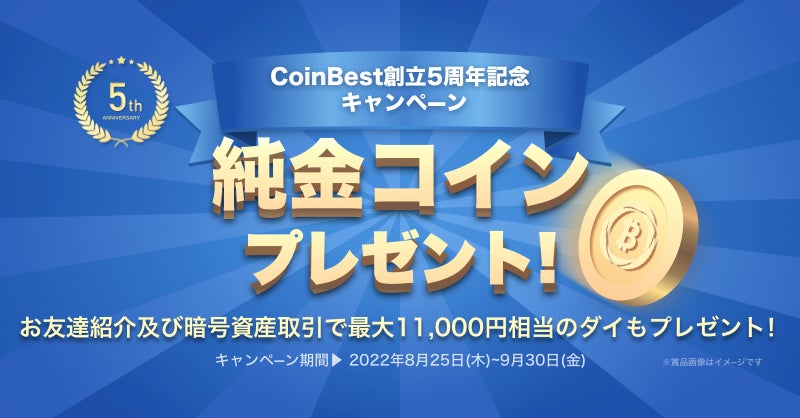 当社ではこれを記念して、2022年8月25日(木)から2022年9月30日(金)まで、CoinBestロゴ入りの純金コインが抽選で5名様に当たるキャンペーンを開催いたします。併せて、同期間中にお友達を紹介いただき、紹介いただいたお友達が当社にて新規に口座を開設し、10,000円以上の取引をいただくと、お友達1名様につき1,000円相当のダイ(お一人様10名様、最大10,000円相当のダイまで)をプレゼント、更に同期間中に当社にて10,000円以上の取引をした方全員に1,000円相当のダイ(DAI)をプレゼントするキャンペーンも開催いたします。