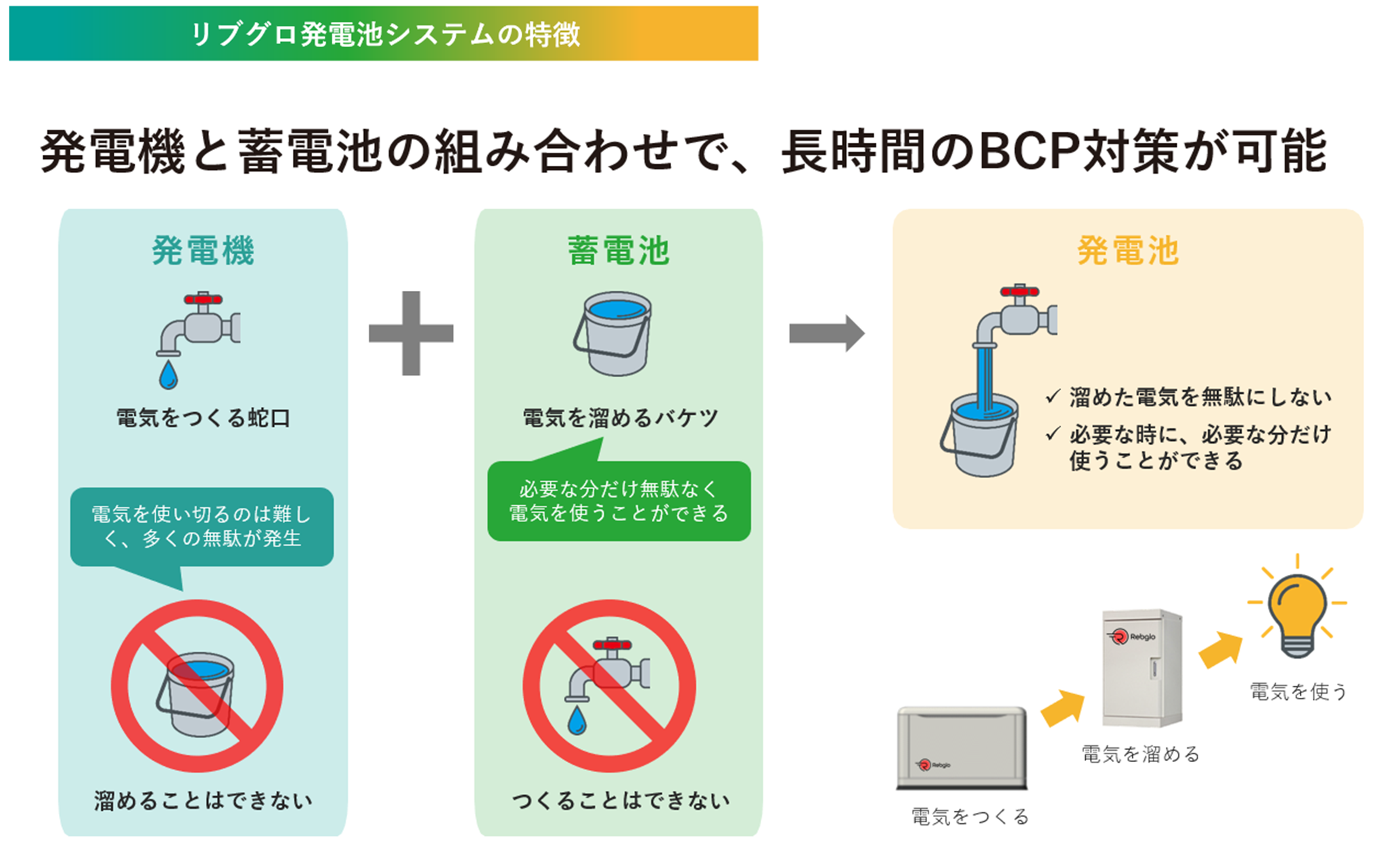 「REBGLO発電池システム」は、温室効果ガスの排出が少なく、環境にやさしいガス発電機と、EV(電気自動車)のリユースバッテリー(UL1974規格品)を活用し、高い安全性を担保に、BCP、SDGsを融合した新世代バックアップ電源「発電池」システムです。