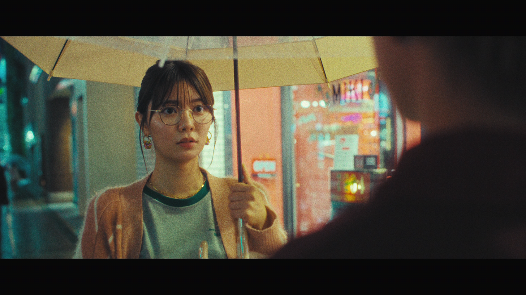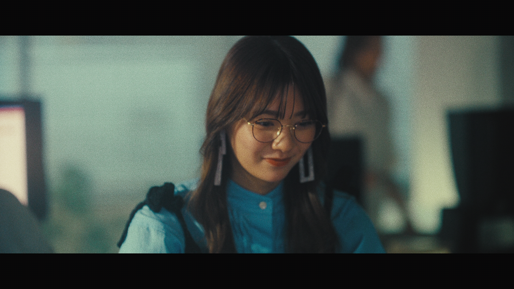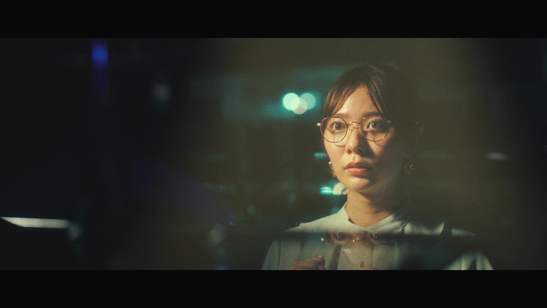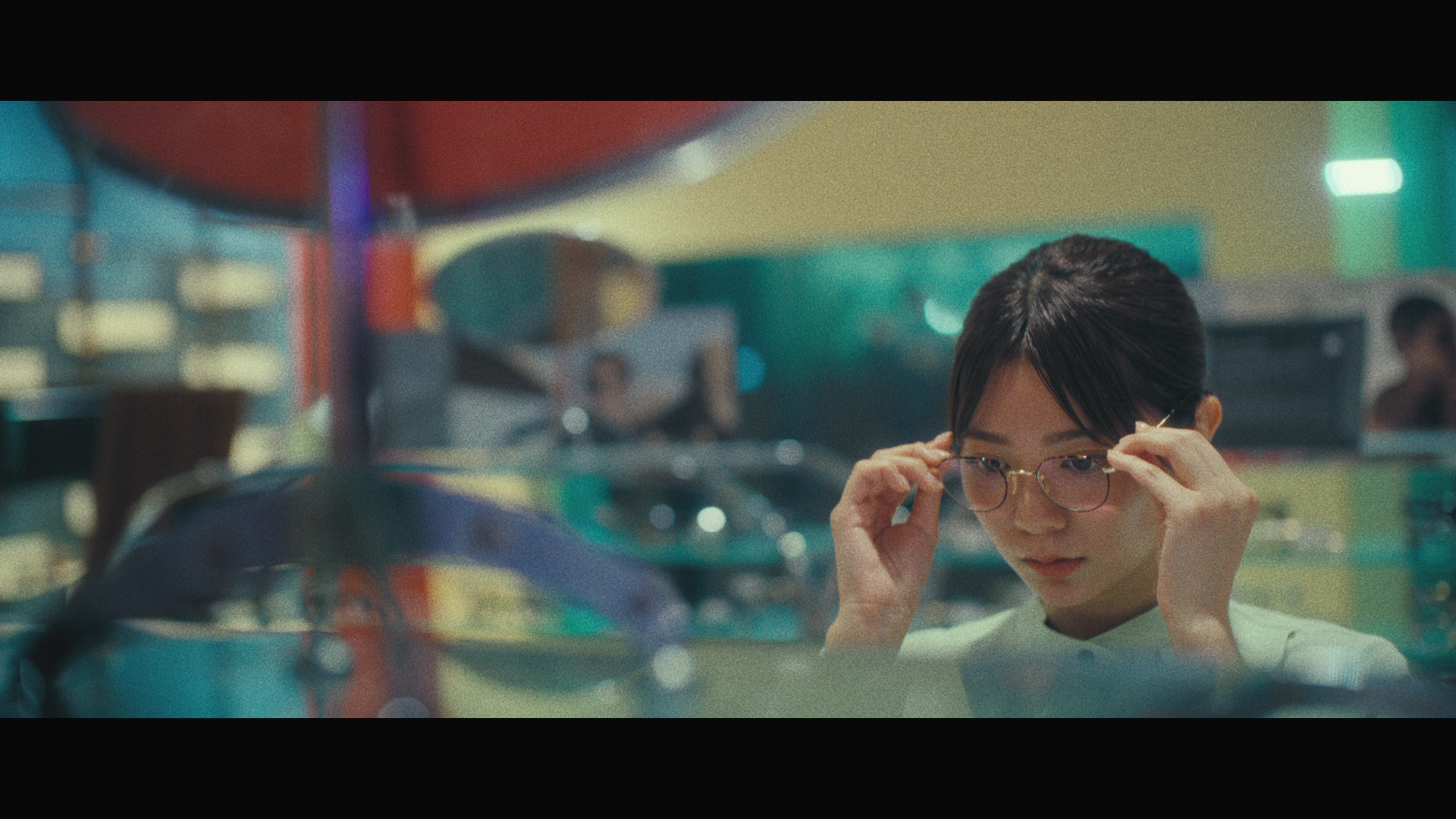 川津明日香さん演じる女性は、オフィスで一人残業をしている様子。オフィスを出た後、バスで隣に座る男性の肩に頭を乗せ眠ってしまい、気まずい雰囲気に。バスから降り少し疲れた表情で歩いていると、メガネ店が現れ、吸い込まれるように店内へ。他にお客さんはおらず、自由にメガネを見てそのうちの一つを手に取り、かけてみることに。突然周りの電気が消え、女性にスポットライトが当たりました。