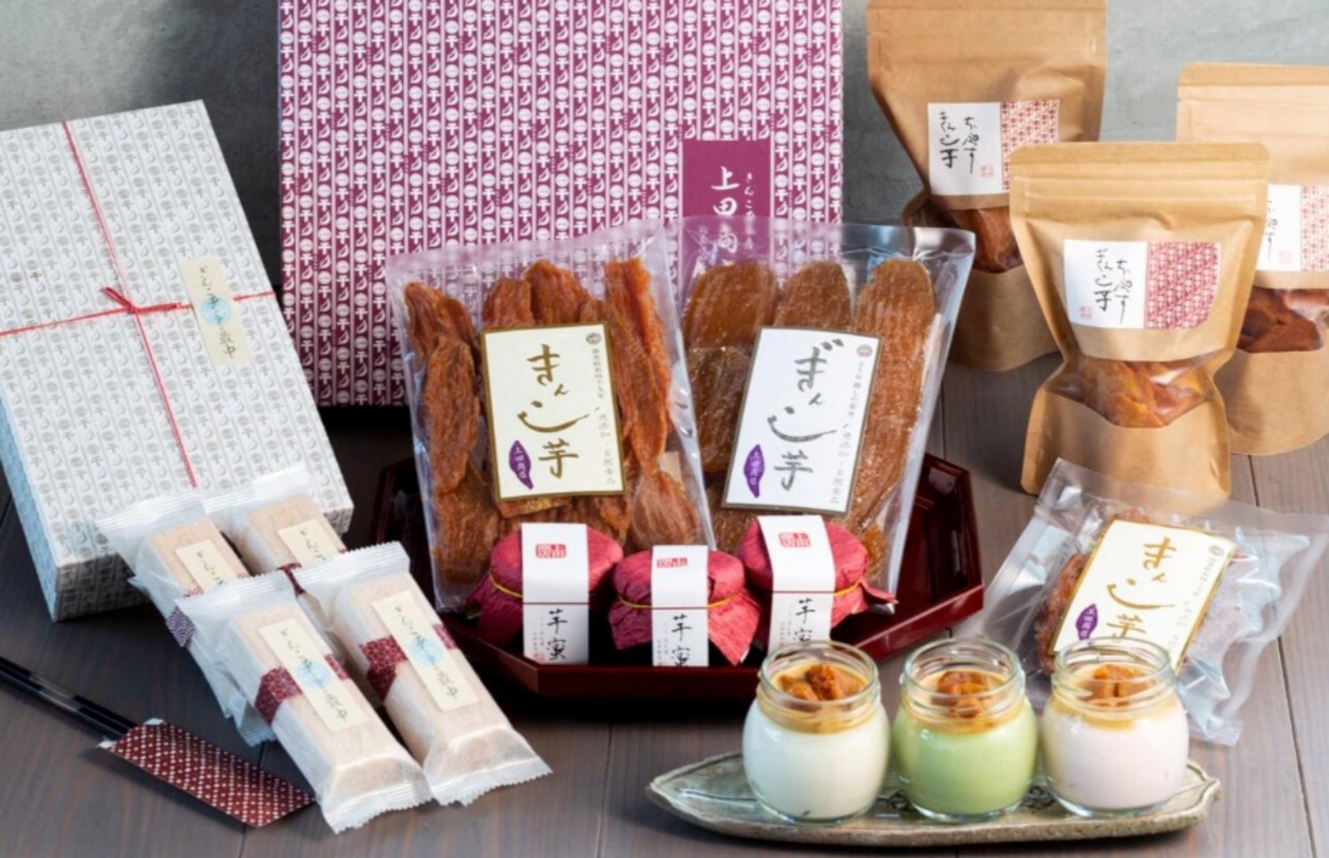 伊勢志摩の干し芋「きんこ芋・ぎんこ芋」とお芋を使ったスウィーツの専門店です。きんこ芋は地域資源であり、この地域だからこそできる伝統食でもあります。 当店では、この文化を引き継ぎ、後世にも残していきたいと考えております。日本一のやわらかさを目指し日々進化する当店の干し芋と、原料芋から作る農家ならではのお芋ごろごろ贅沢スウィーツをお楽しみください。上田商店の商品を召し上がっていただく時間が、感動的で心豊かな時間となりますように。