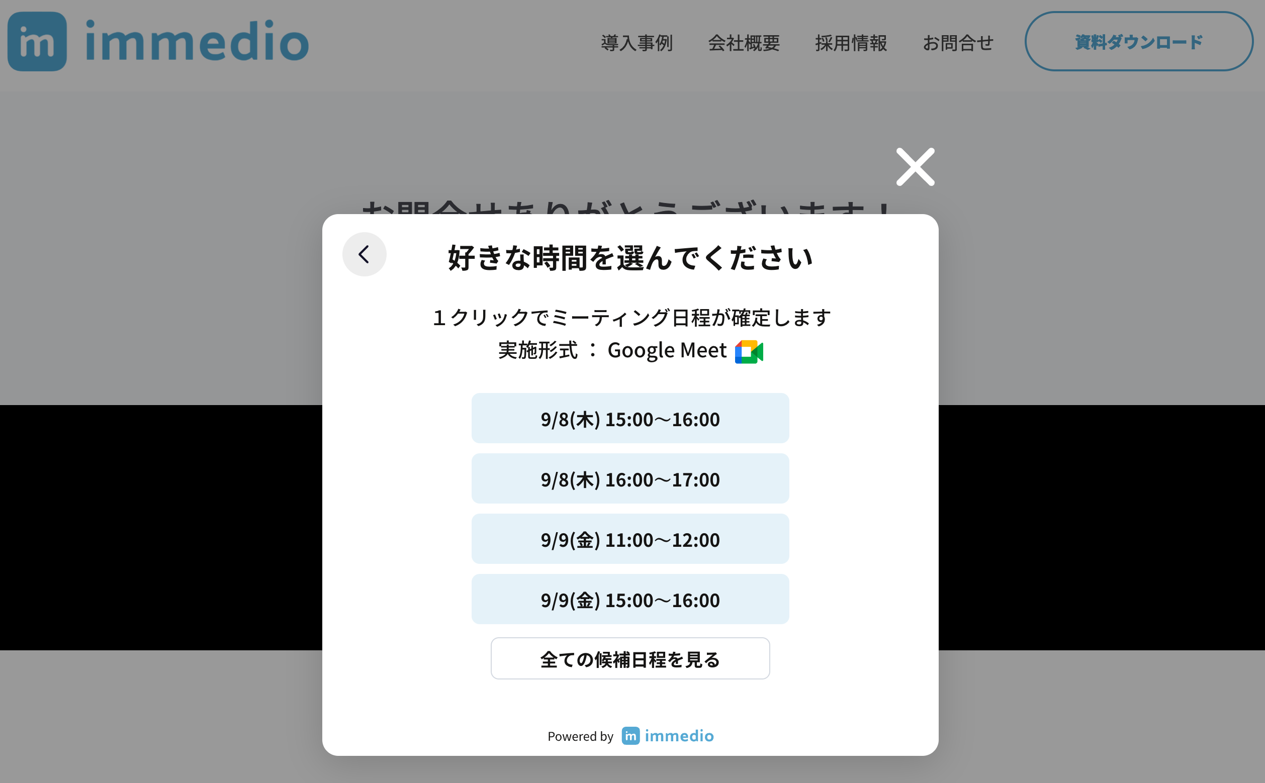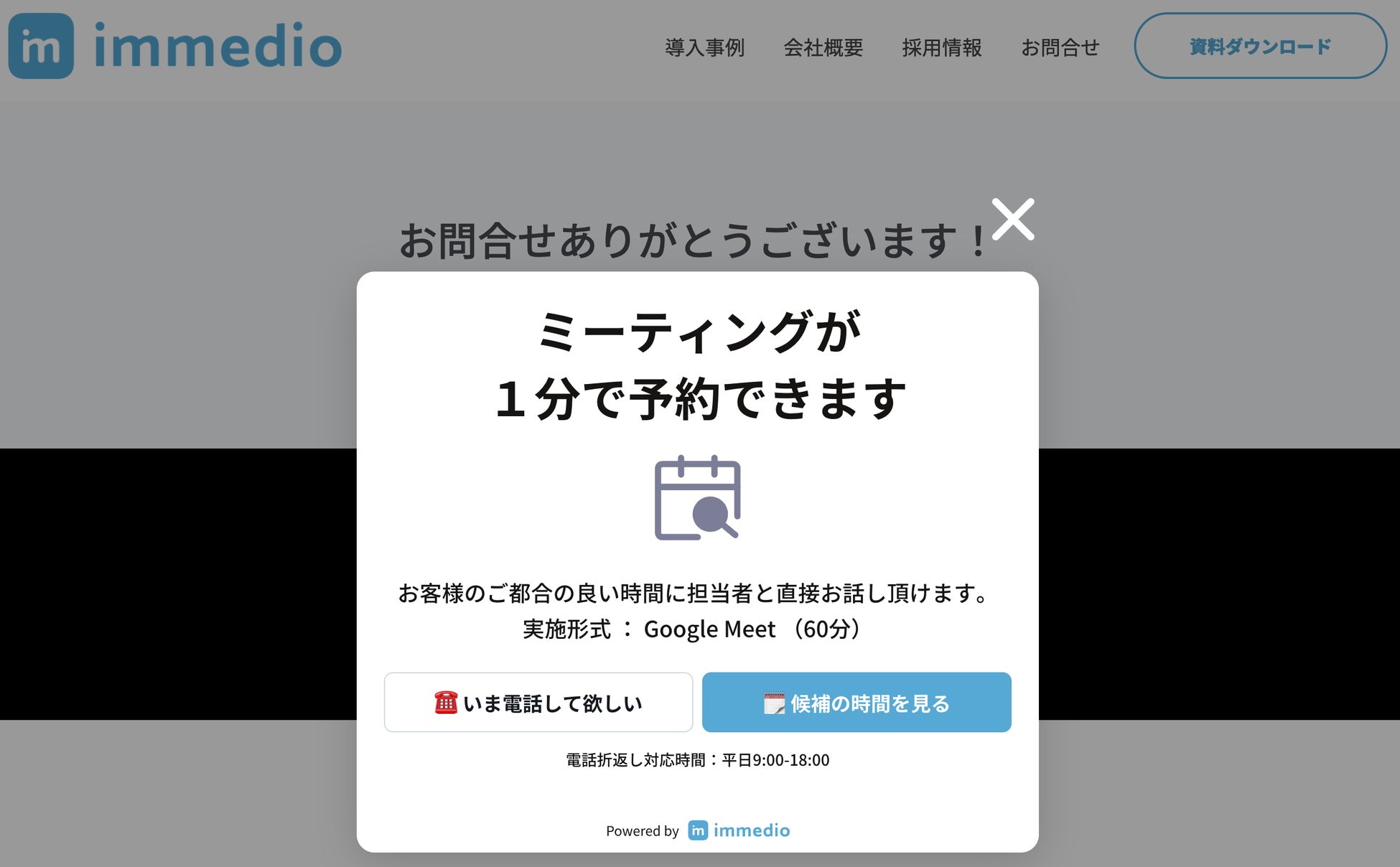 「immedio」はウェブフォーム連動型の商談獲得自動化サービスです。各企業が現在利用するフォームとThanksページに「immedio」提供のタグを埋め込むことにより、Thanksページ上に日程調整画面が自動的に表示されます。フォームの入力情報が「immedio」に同期されているため、自動的にリードの見極め・割当てが行われており、日程調整画面には適切な担当者の空き時間が提示されます。GoogleカレンダーやZoomと連携しているため、見込み客が日程を選択した時点でビデオ会議のURLが入った会議通知が自動で送信されます。