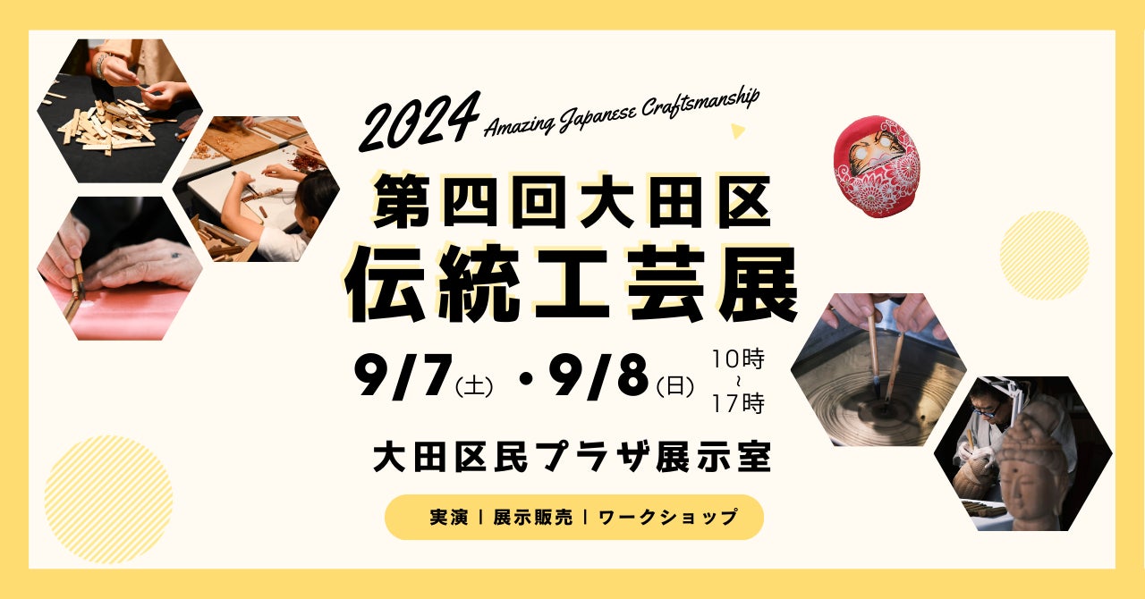 一般社団法人 大田区伝統工芸発展の会(理事長:吉澤均、 大田区南蒲田)は、2024年9月7日(土)、8日(日)に大田区民プラザ(大田区下丸子)にて、大田区伝統工芸の実演イベント「第四回大田区伝統工芸展」を開催いたします。大田区で活動する当会所属職人が全員参加して、実演作業・作品展示を行い、ワークショップを通じてモノづくりを身近に体験していただけるイベントとなっています。また、両日とも氷彫刻のライブパフォーマンスや、大田区出身の書家・金澤翔子さんのサイン会、大田区の公式キャラクター「はねぴょん」の登場もあり、大田区ならではの魅力あふれるコンテンツをご用意しています。当会の地域貢献と伝統工芸の未来伝承への取り組みを当イベントでぜひご覧ください。【入場無料】