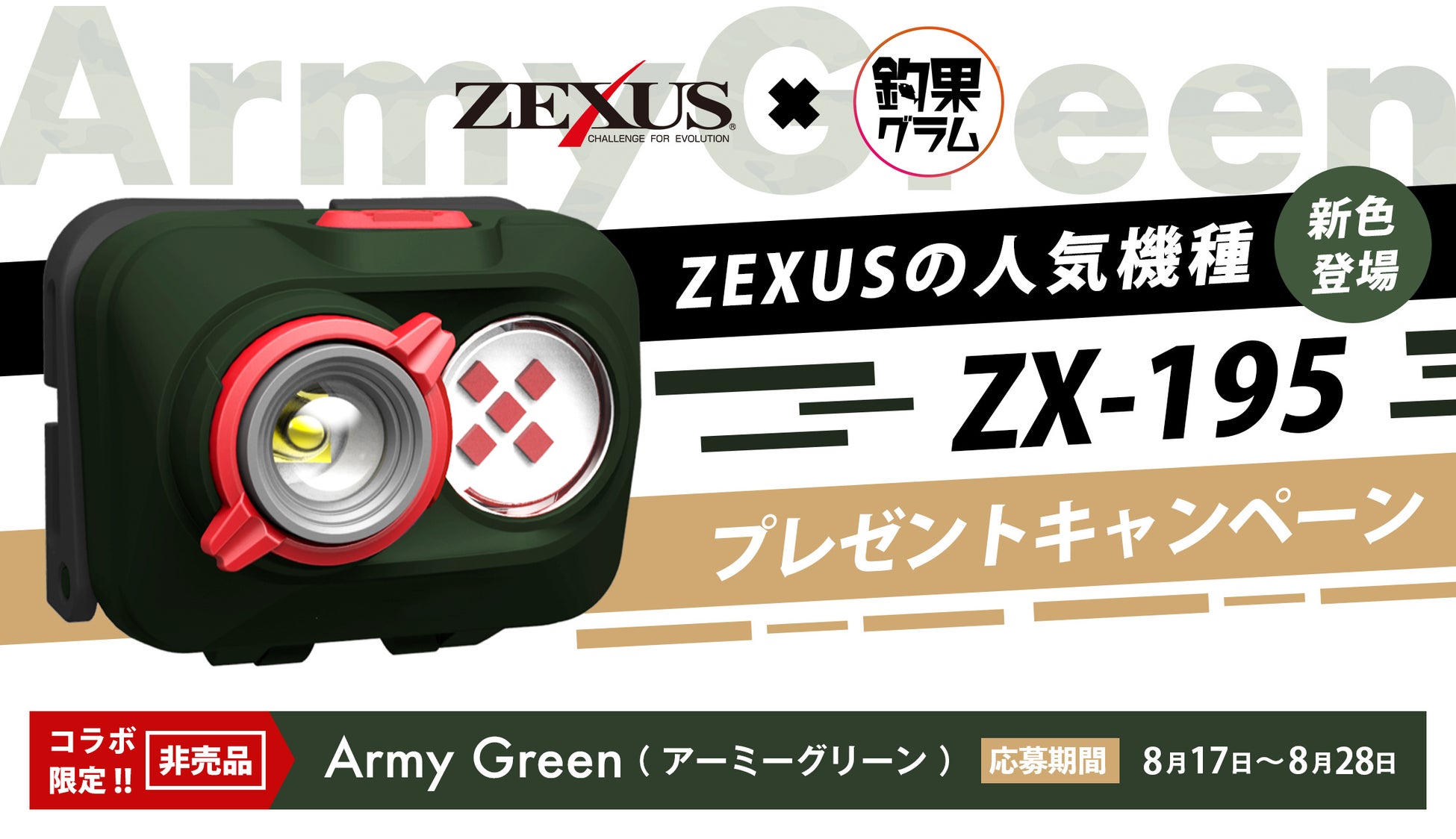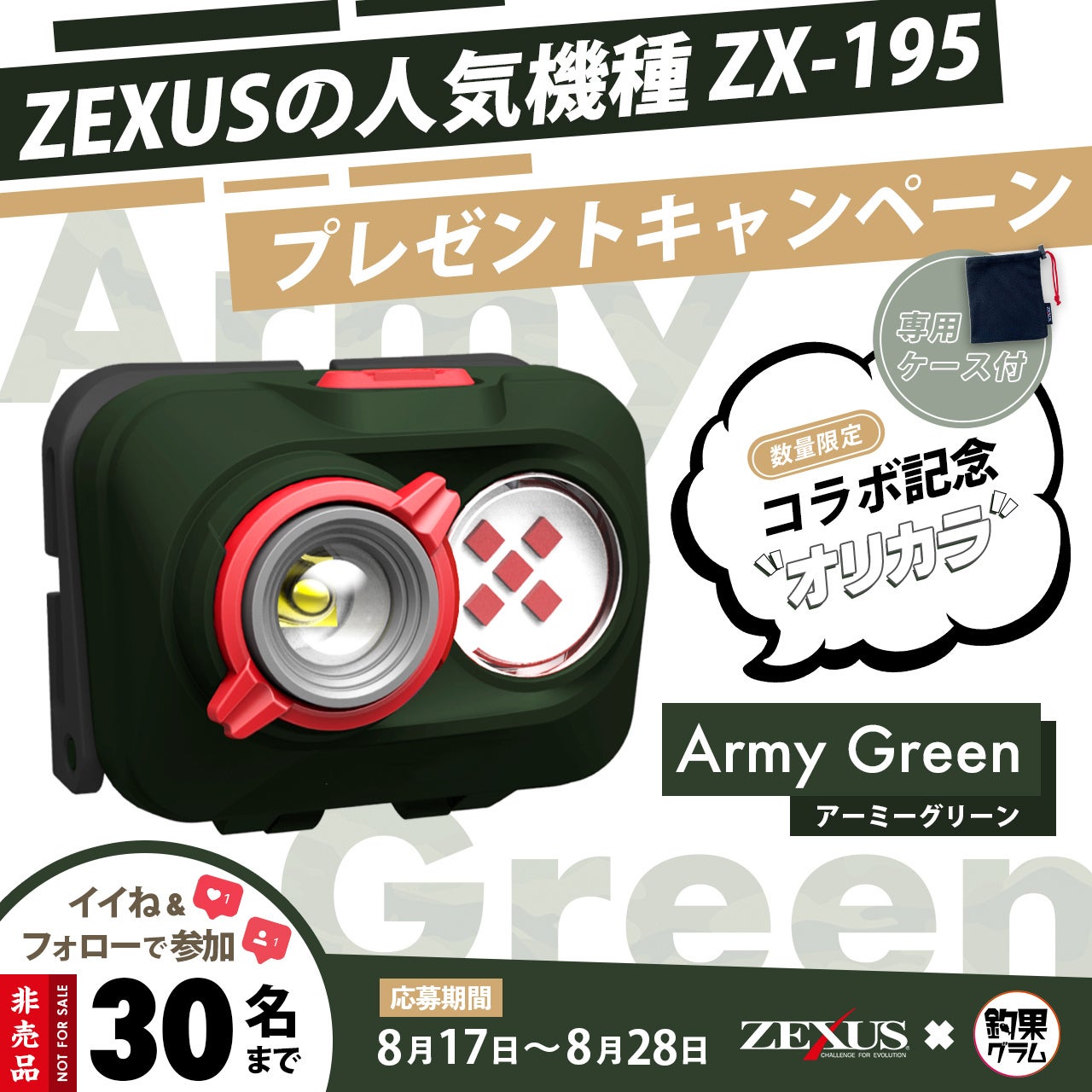 冨⼠灯器株式会社が展開するヘッドライトブランド「ZEXUS」は、釣り専⾨のInstagramアカウントとして最⼤級のフォロワーを持つ「釣果グラム」とタッグを組み、主⼒商品ZX-195のコラボ限定新⾊Army Green<アーミーグリーン>を30名様にプレゼントする⼤型キャンペーンを実施いたします。