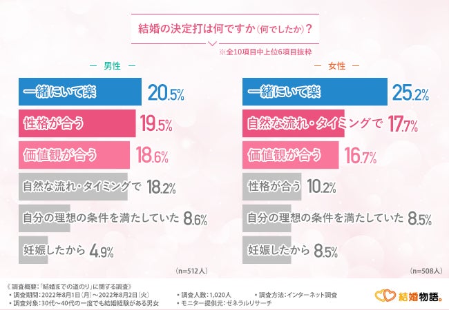 一方、女性は、『一緒にいて楽(25.2%)』と回答した方が最も多く、次いで『自然な流れ・タイミングで(17.7%)』『価値観が合う(16.7%)』と続きました。