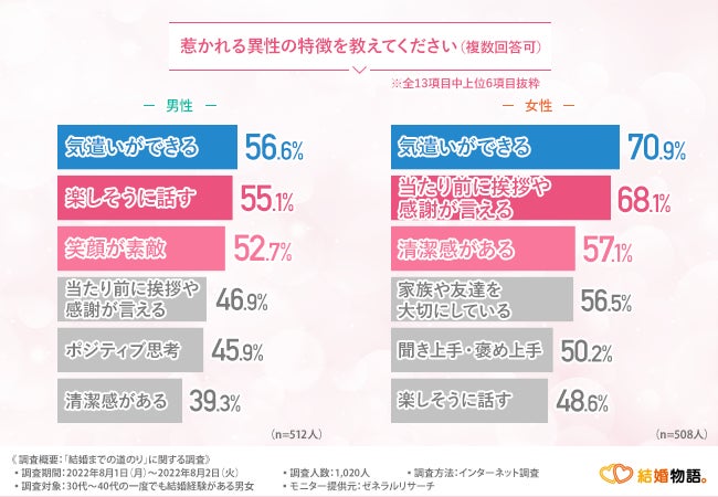 一方、女性は『気遣いができる(70.9%)』と回答した方が最も多く、次いで『当たり前に挨拶や感謝が言える(68.1%)』『清潔感がある(57.1%)』と続きました。
